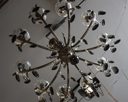 Prachtige kroonluchter met metalen armen en gerookte glazen kristallen. Het metaal is mooi gegrafeerd. Een bijzonder item voor boven de eettafel of in de hal. De lamp heeft 10 armen voor verlichting. De doorsnede is ongeveer 65 cm en de totale hoogte is 75 cm. De foto’s spreken voor zich.