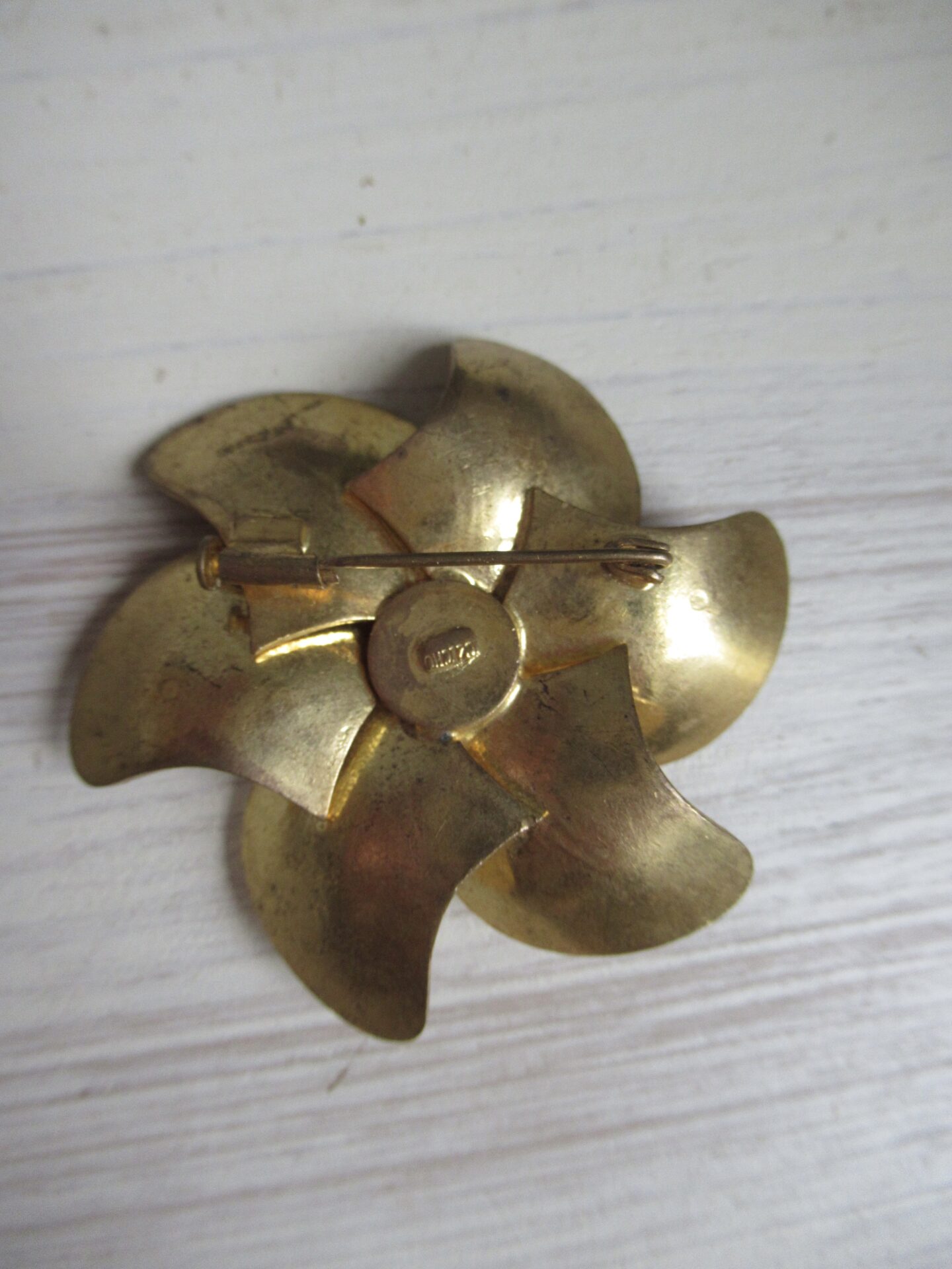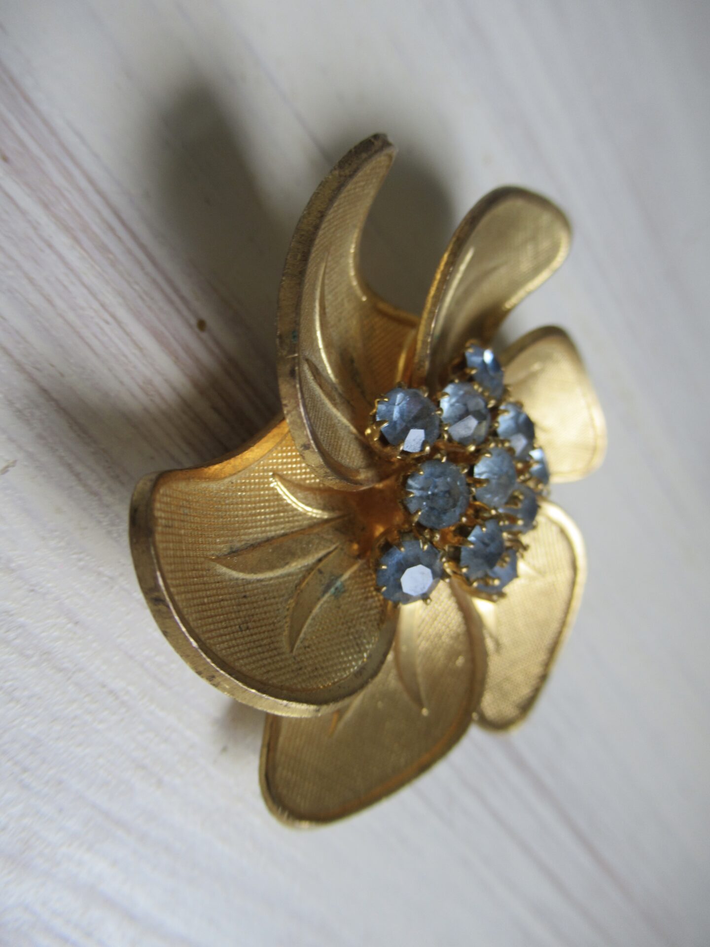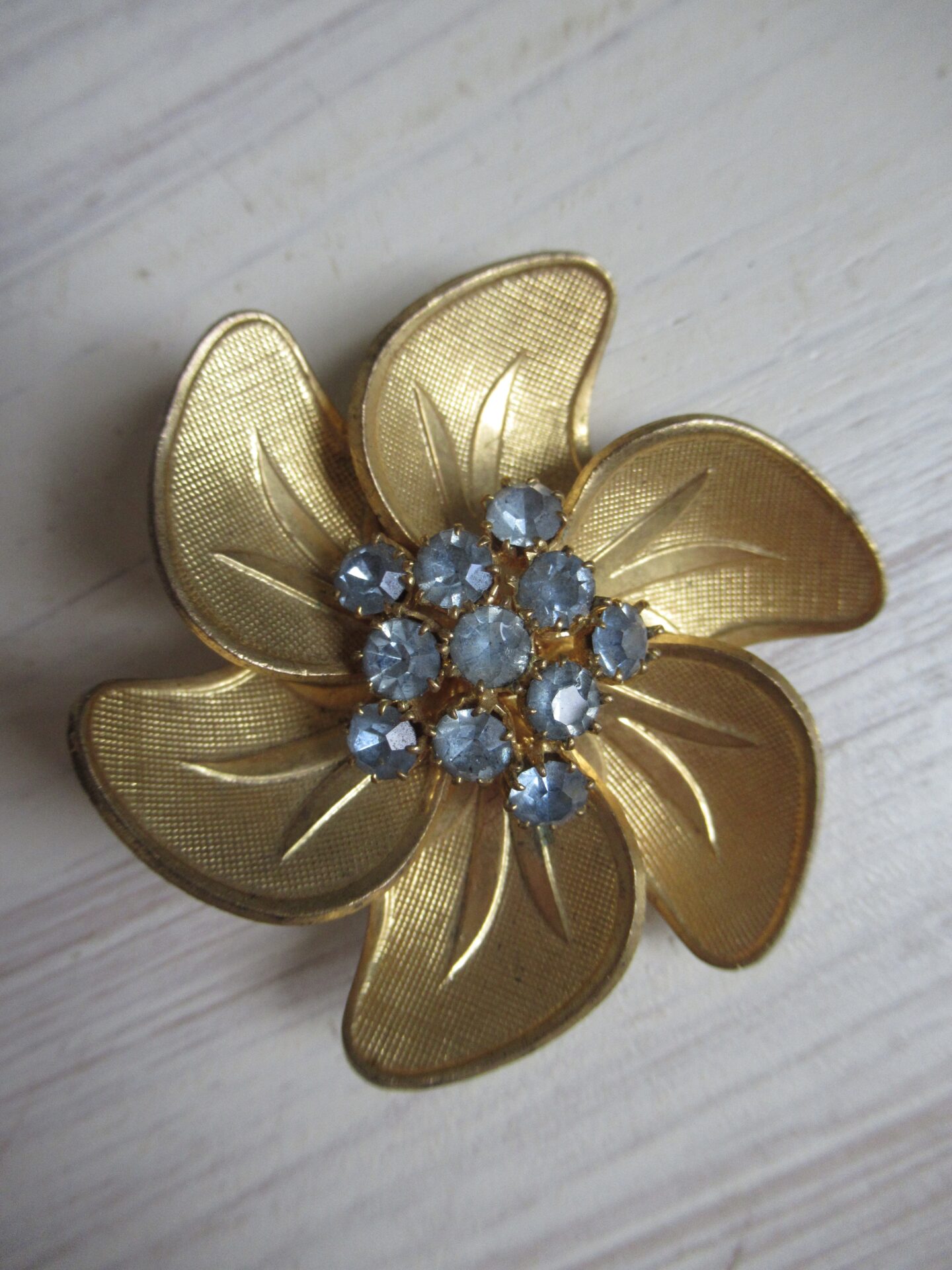 mooie oude Franse broche met lichtblauwe strass-steentjes, met (bajonet-) veiligheidssluiting (doorsnede 5 cm)