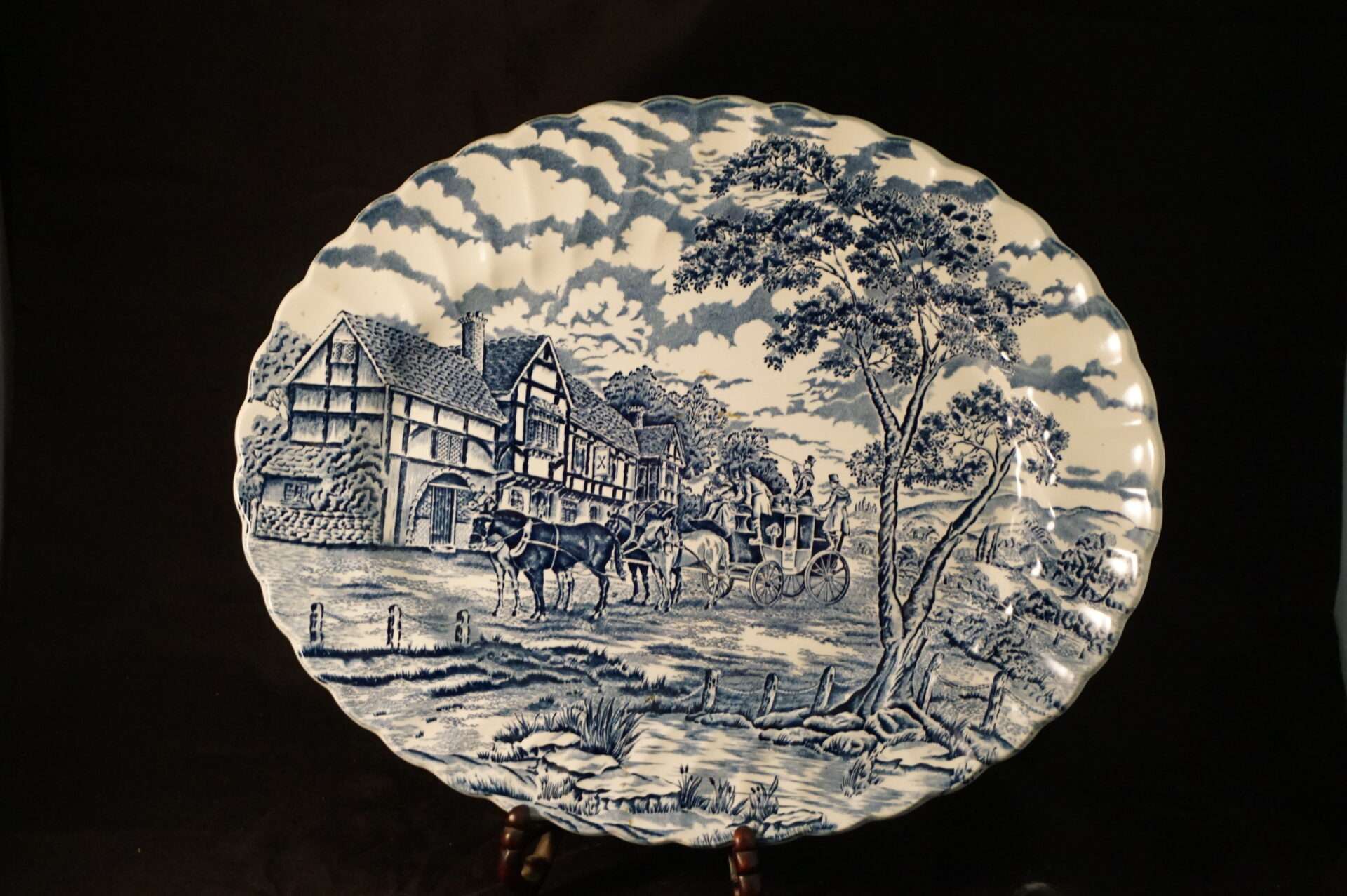 Een ovale schaal van Myott in het “Royal Mail” patroon, een bekend blauw-wit Engels servies.