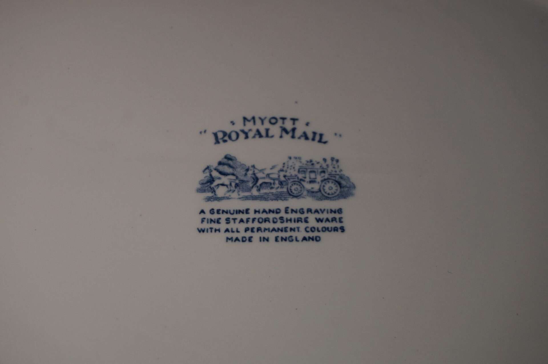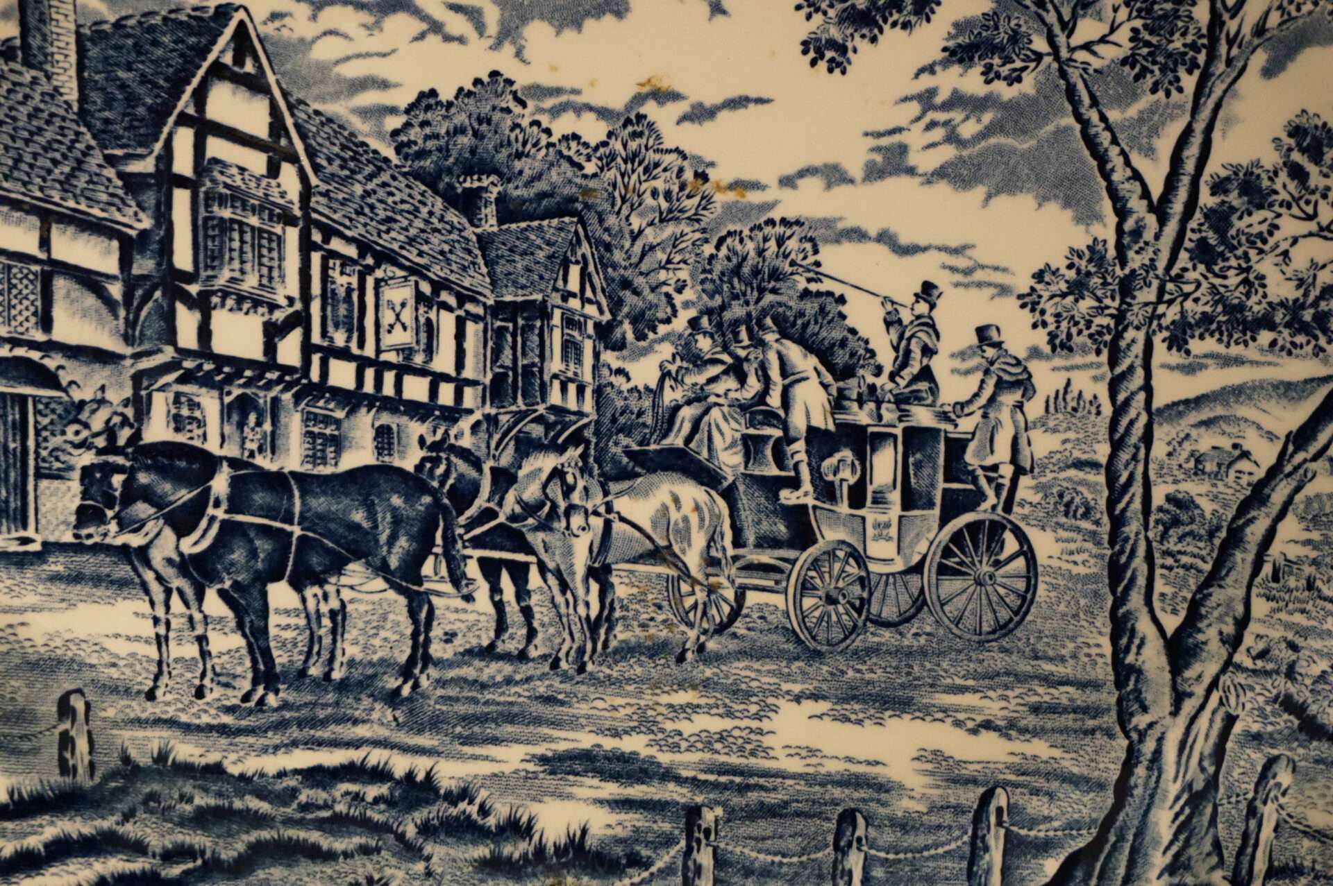 Dit type servies staat bekend om zijn gedetailleerde scènes, zoals de afgebeelde paardenkoets en gebouwen, die kenmerkend zijn voor het Engelse plattelandsleven of historische taferelen. Myott was een Engelse aardewerkfabrikant die bekend stond om zijn transferware, waarbij ontwerpen op keramiek werden overgebracht.