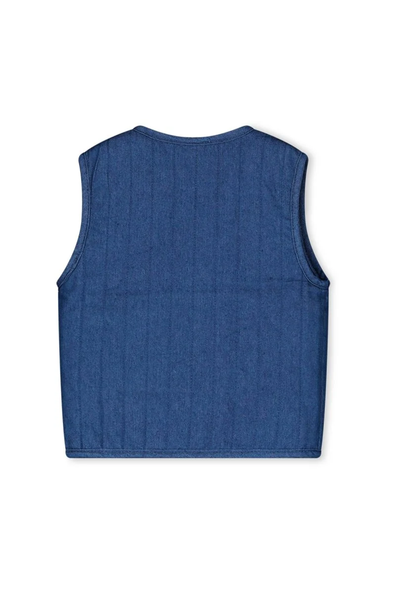 Dit veelzijdige blauwe Nika vestje kan op verschillende manieren worden gedragen. Het is ideaal als extra laagje en kan gedragen worden als stijlvolle toevoeging aan een winterse outfit. Combineer dit item met de groen gebreide trui Ruth of juist met de jumpsuit Jules. Dit denim-look vestje is eindeloos te combineren.