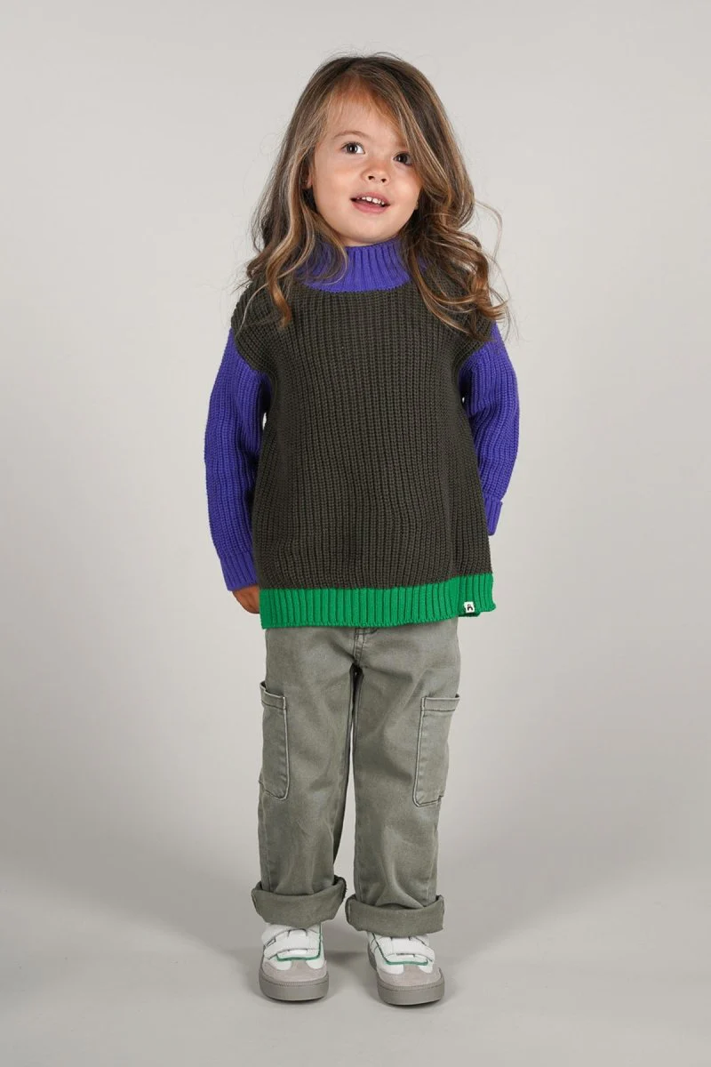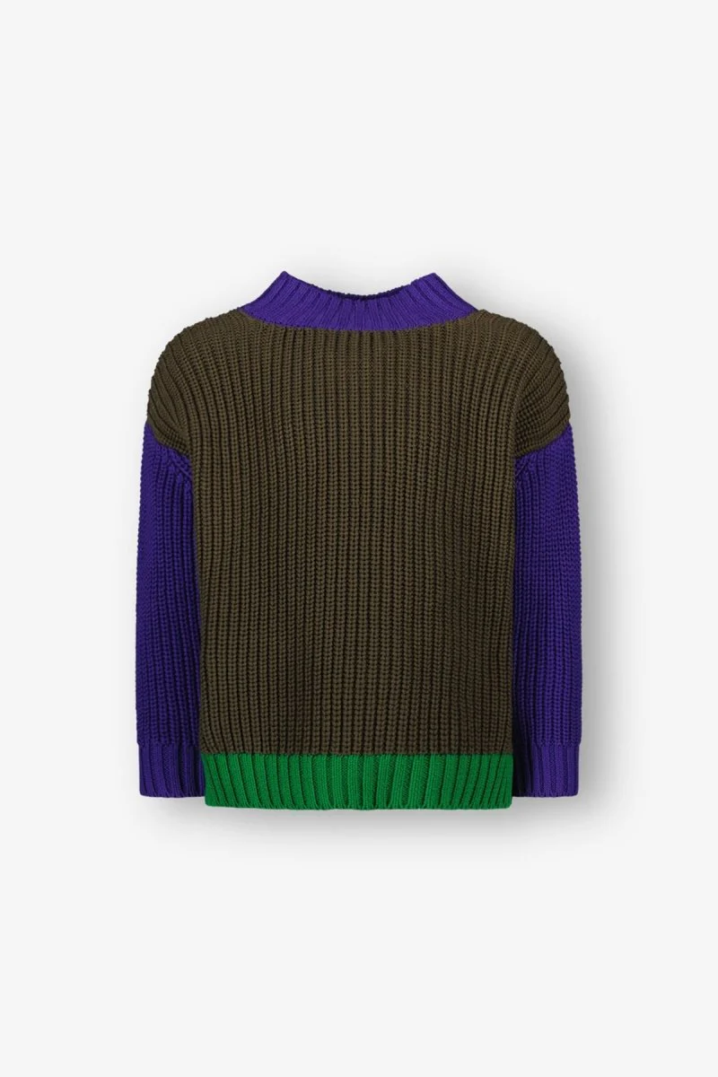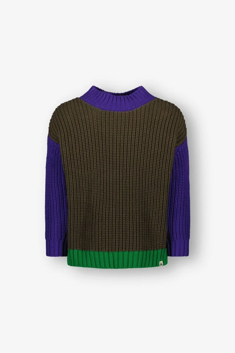 Colorblock away! De Noah trui heeft een super toffe kleurverdeling met groen en paars. Daardoor is de gebreide trui gemakkelijk met heel de collectie te combineren. Duurzaam gemaakt.