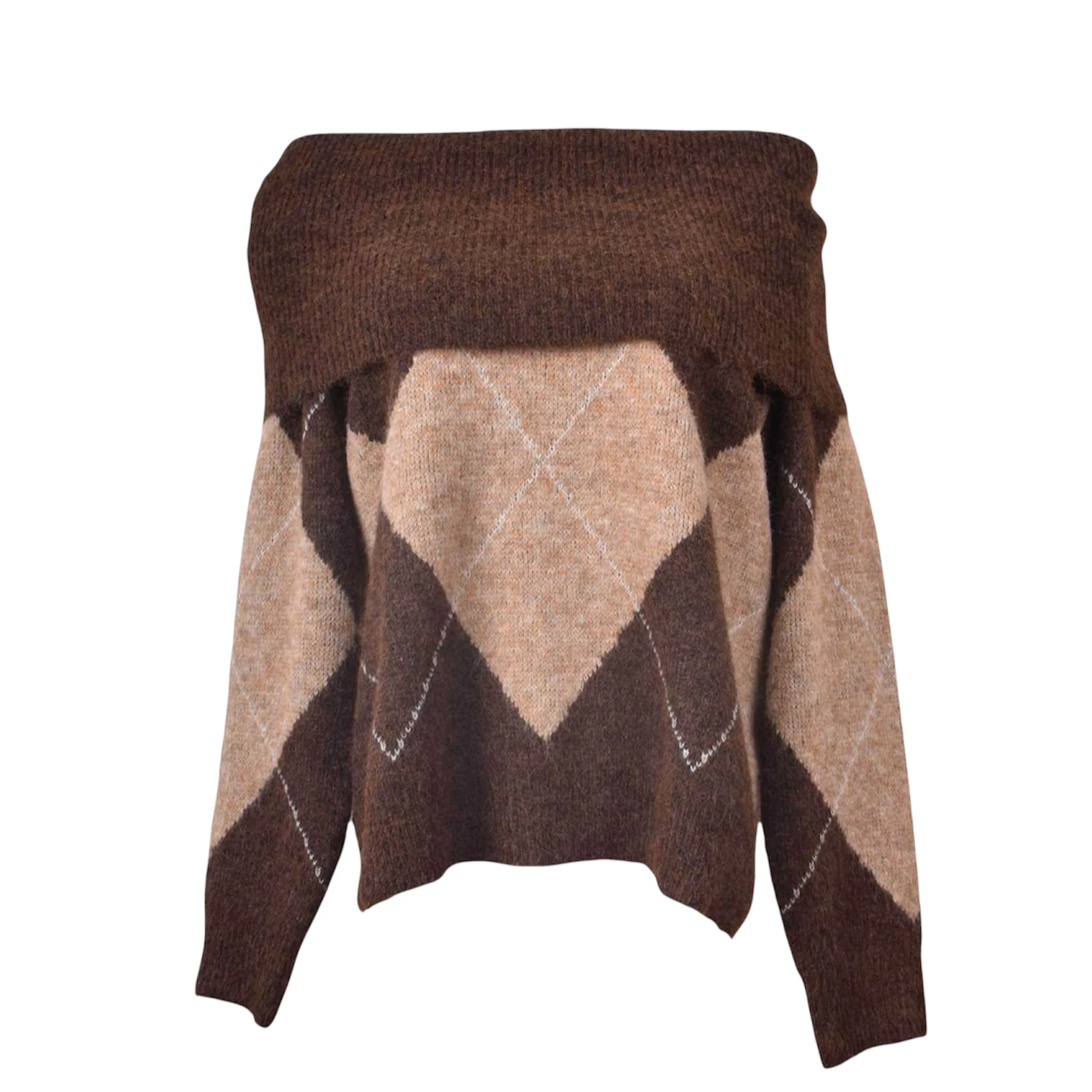 Offshoulder Trui met Argyle Ruit. Een knitwear in de kleurencombinaties bruin en camel.