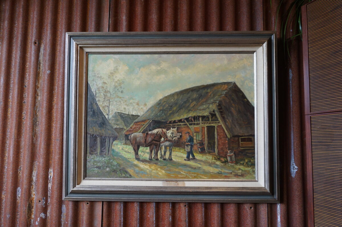 Olieverf schilderij gemaakt door Jan Koning. De wieg van Jan Koning stond aan de Westfriese Omringdijk, in buurtschap De Kreil. Het grootste deel van zijn leven bracht hij in Schagen door, samen met zijn vrouw. Dit schilderij heeft de voorstelling van een boerenerf met paarden en de boer die de paarden gaat voeren. Waarschijnlijk speelt dit zich af in de buurt van Jan zijn leefomgeving. Afmeting: 60 cm hoog en 80 cm breed, met lijst 80 cm hoog en 100 cm breed.