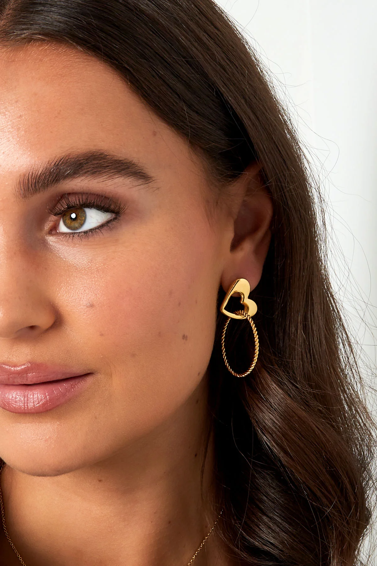 Goudkleurige oorbellen in de vorm van een hartje met gedraaide ring. De oorbellen zijn superleuk te combineren met meerdere minimalistische sieraden. Ook leuk om deze oorbellen te combineren met meerdere statement sieraden. De oorbellen zijn gemaakt van stainless steel en hebben een afmeting van 4,5 cm.