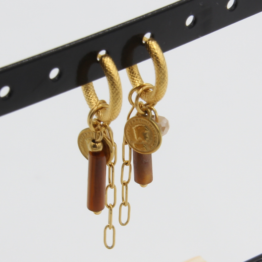 Oorring met tube, muntje en kettinkje-bruin/goud