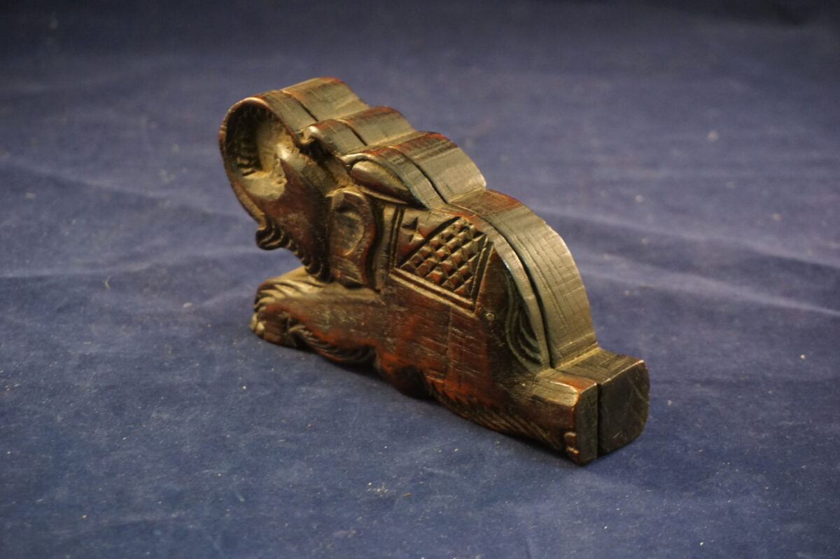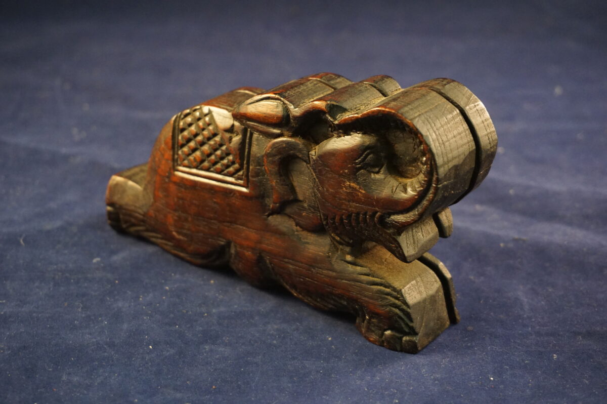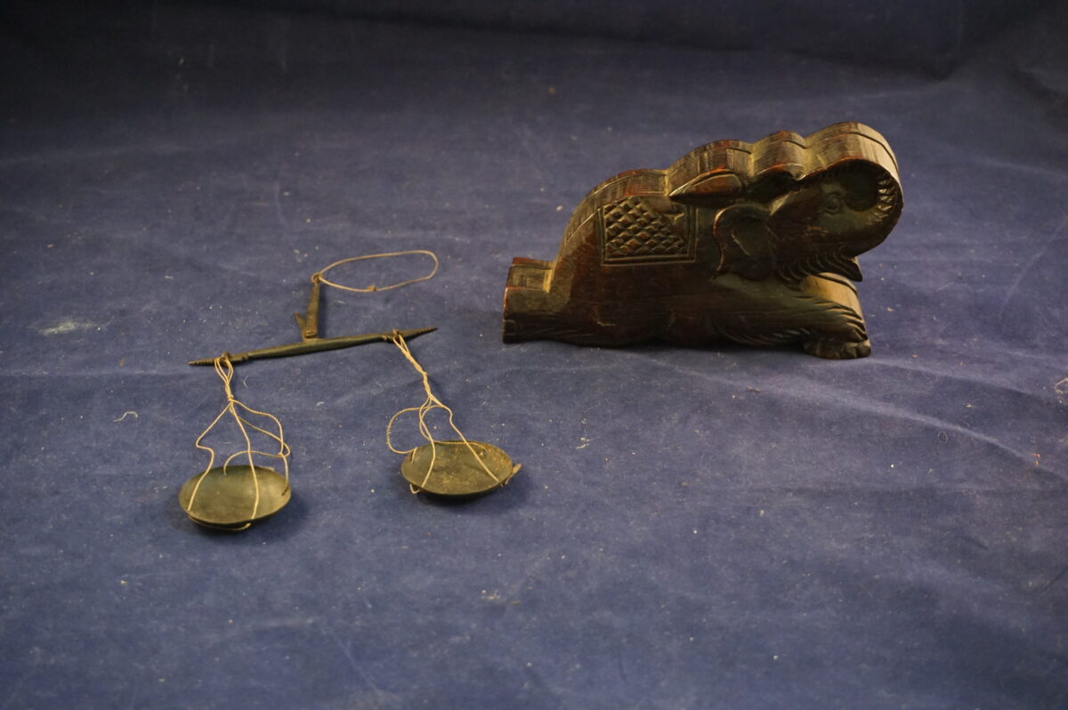 Vintage olifant kistje met een opium balansweegschaal. Gemaakt in India omstreeks 1950-1974. Afmeting kistje: 16 x 9 x 3.5 cm.