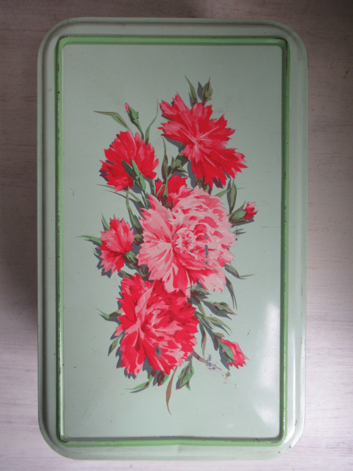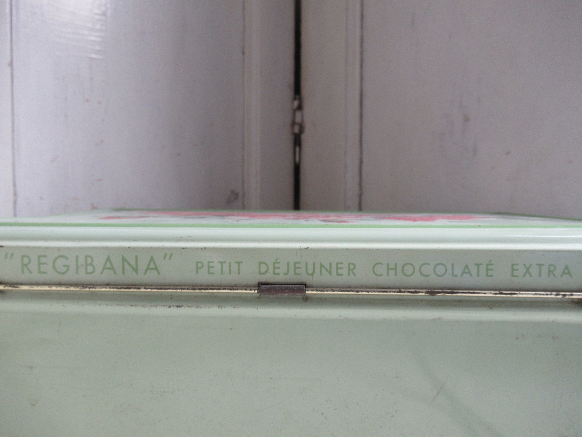 oud Frans blik, in mooie staat, heeft een licht deuk aan de voorkant, geen verfverlies en één scharniertje is afgebroken, blik sluit goed (31 bij 19 cm, hoogte 13,5 cm)