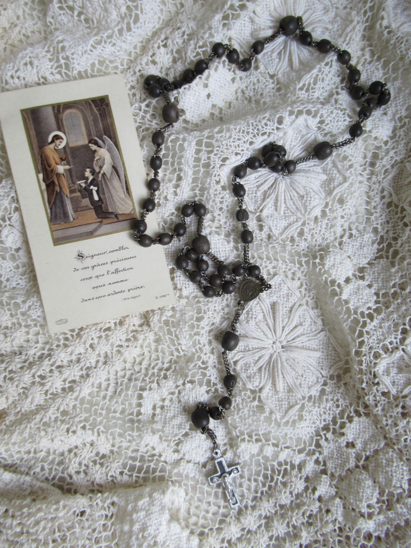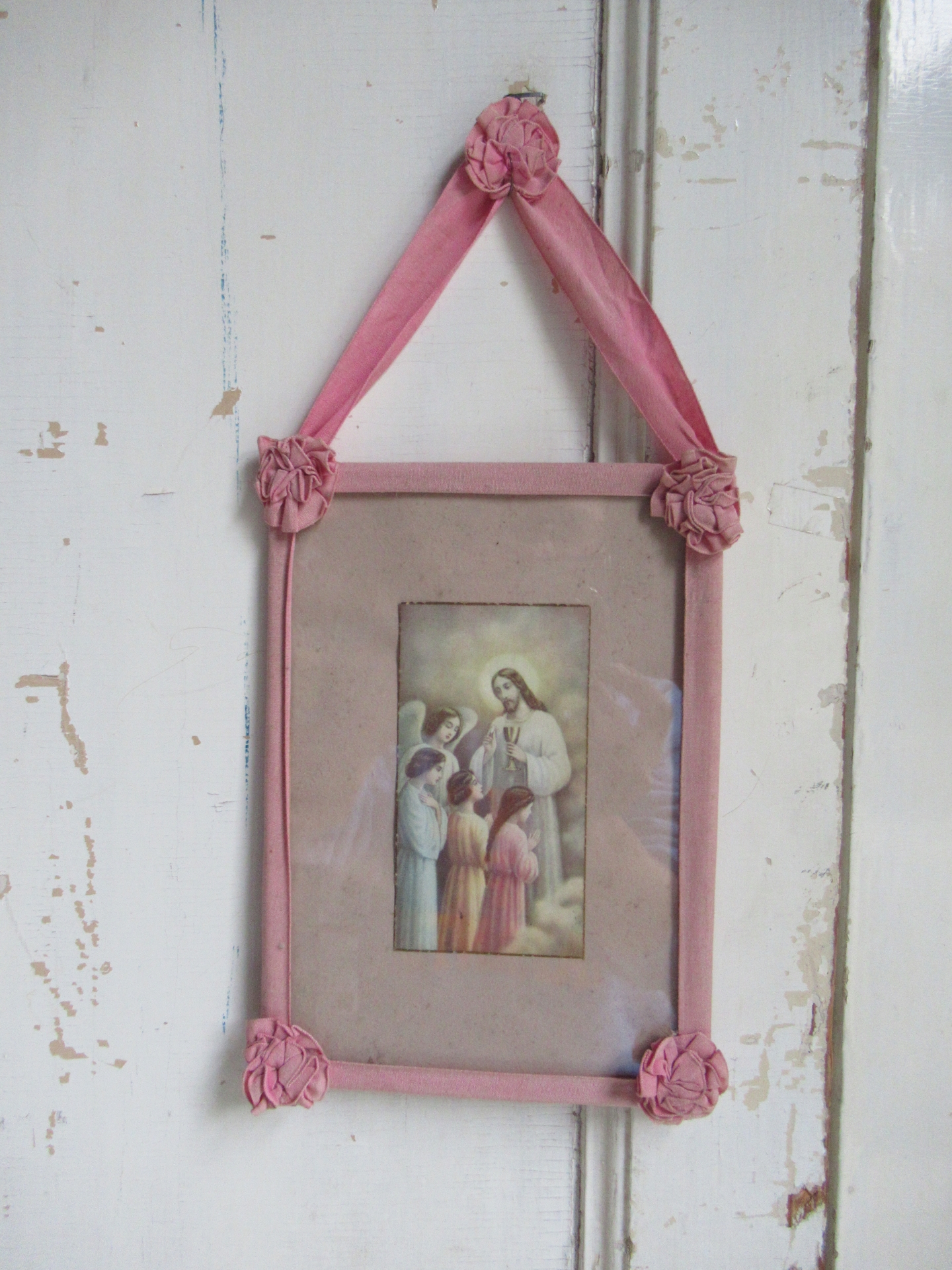 schattig oud Frans heiligenlijstje, prentje achter glas omlijst met roze lint en bloemetjes op de hoeken, achterkant een retro stofje, handwerk (13,5 bij 19 cm, exclusief ophanglint)