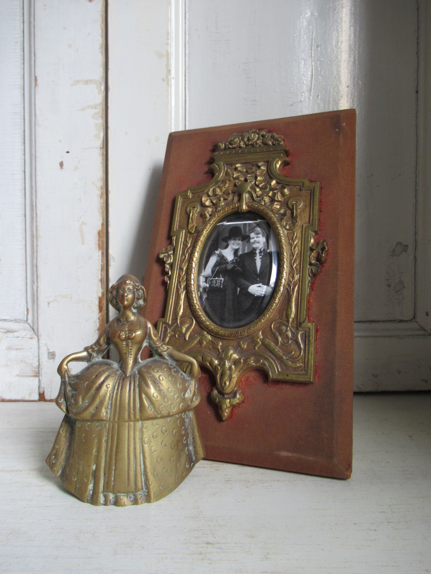 oud striklijstje, lijkt heel oud, achterkant is wat gammel en sluit niet, maar het glasplaatje en foto blijven zitten als het lijstje staat, onderop het ijzer staat ‘made in Japan’ (14,5 bij 9,5 cm)