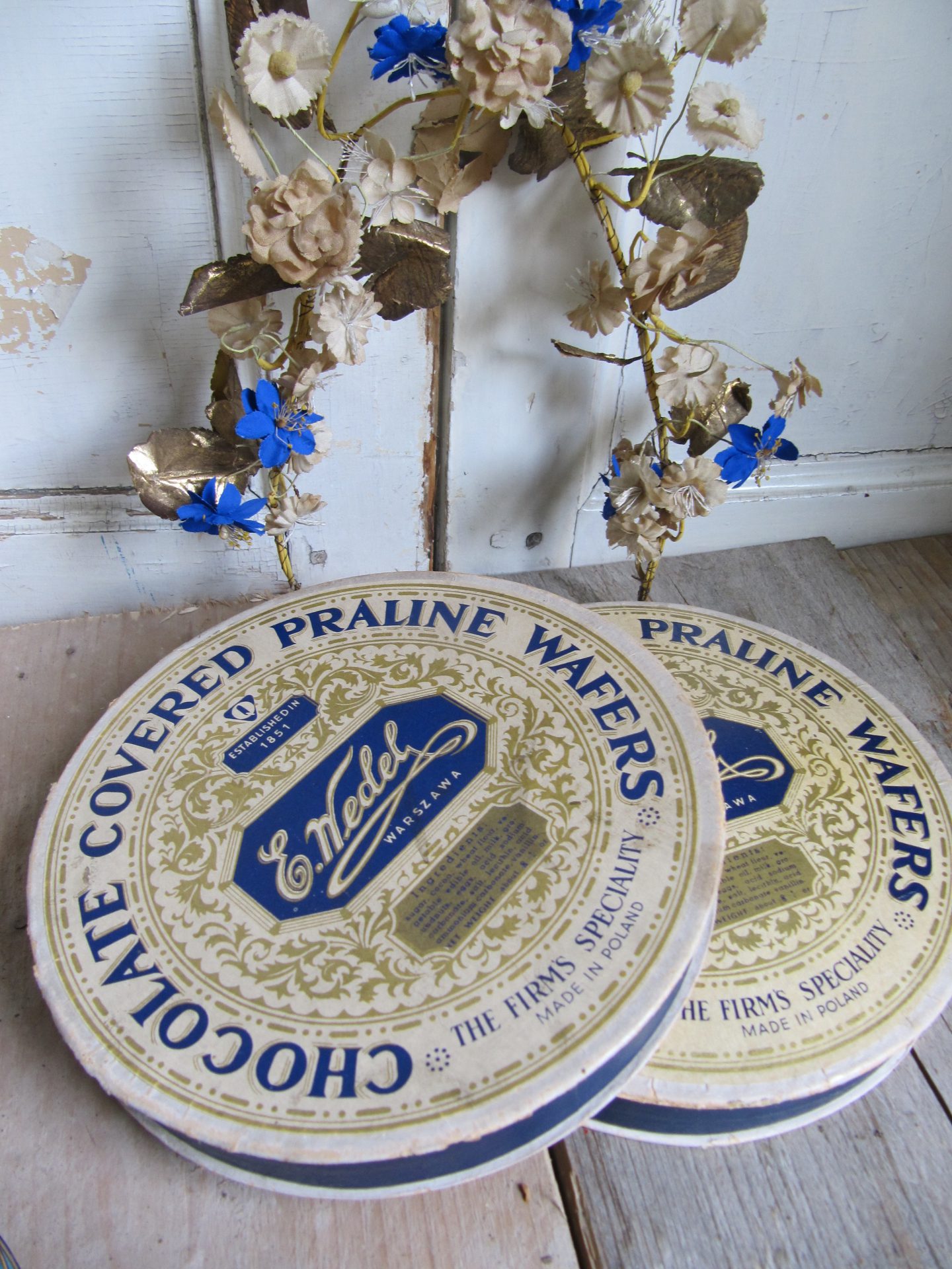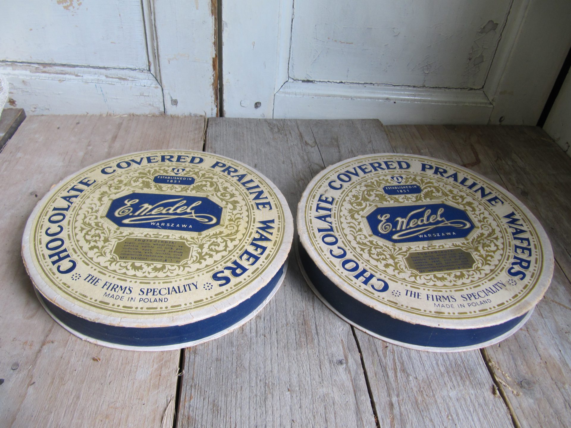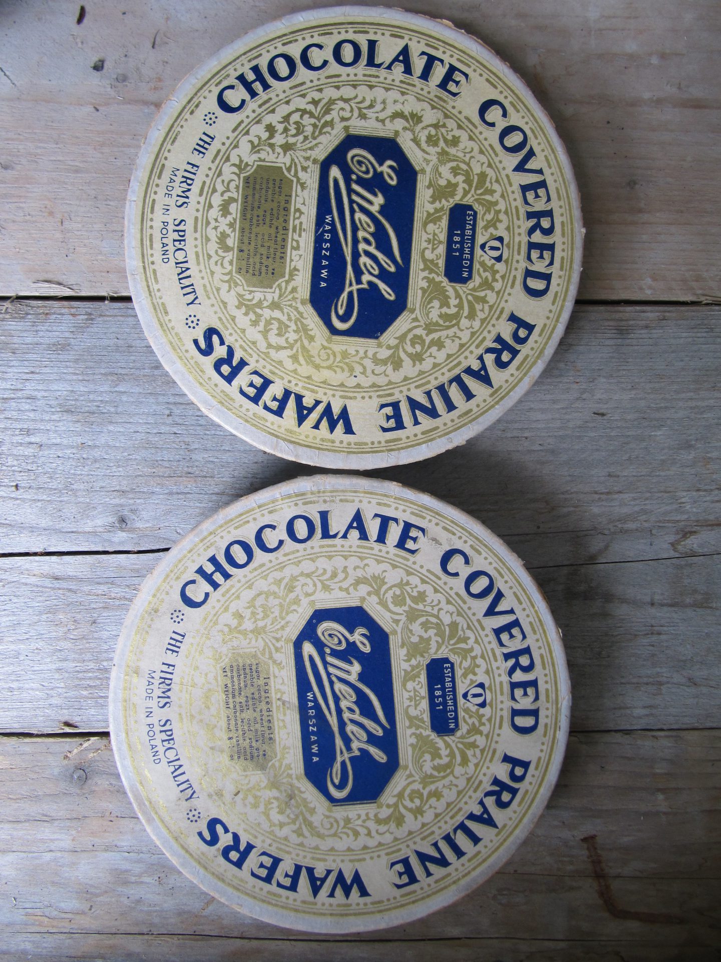 oude chocolade doos, ‘chocolate covered praline wafers, made in Poland, prijs is per stuk (doorsnede 19 cm, 3 cm hoog)