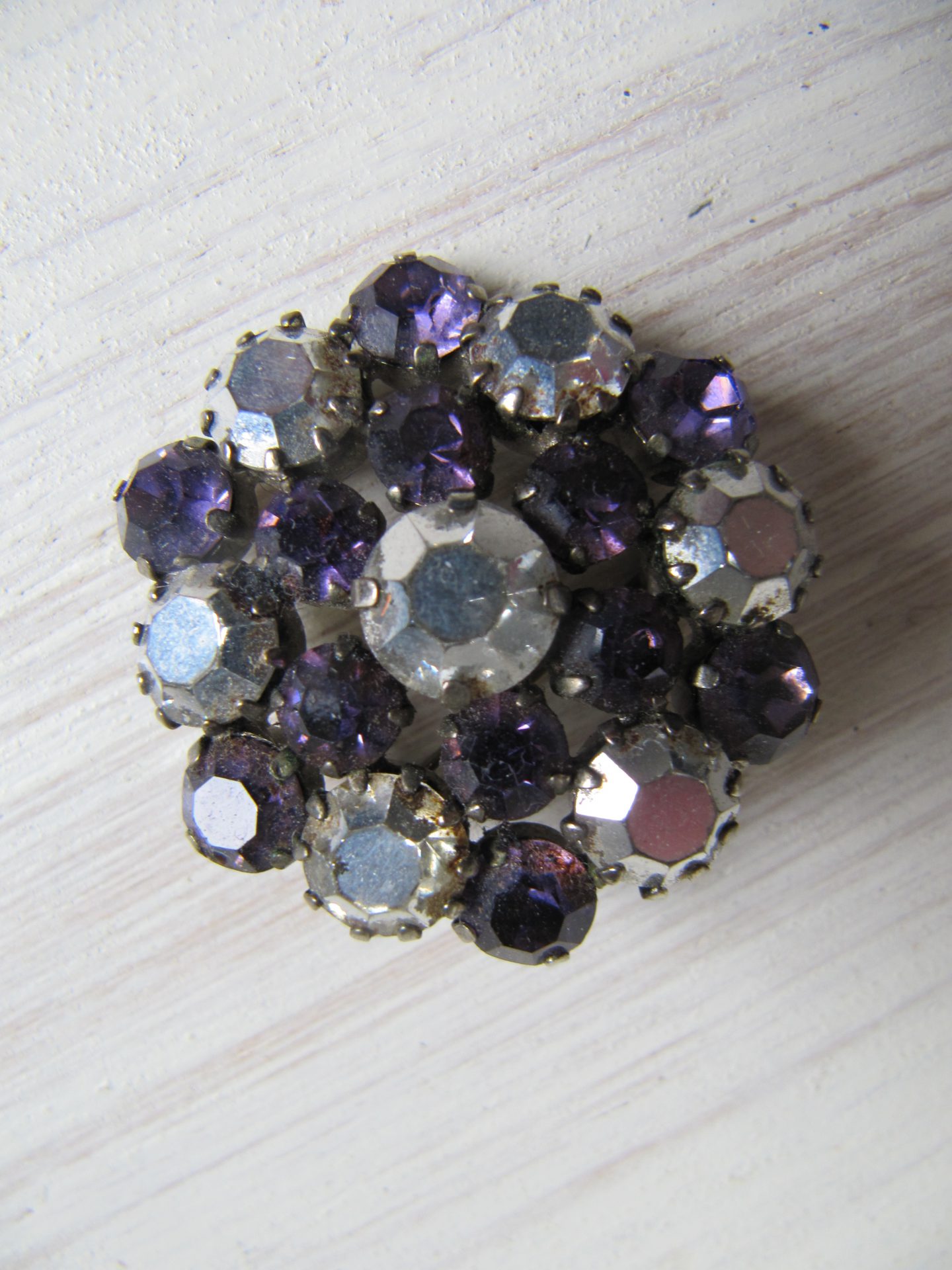 oude Franse broche, 2 kleuren paarse strass steentjes, met veiligheidssluiting (doorsnede 3,5 cm)