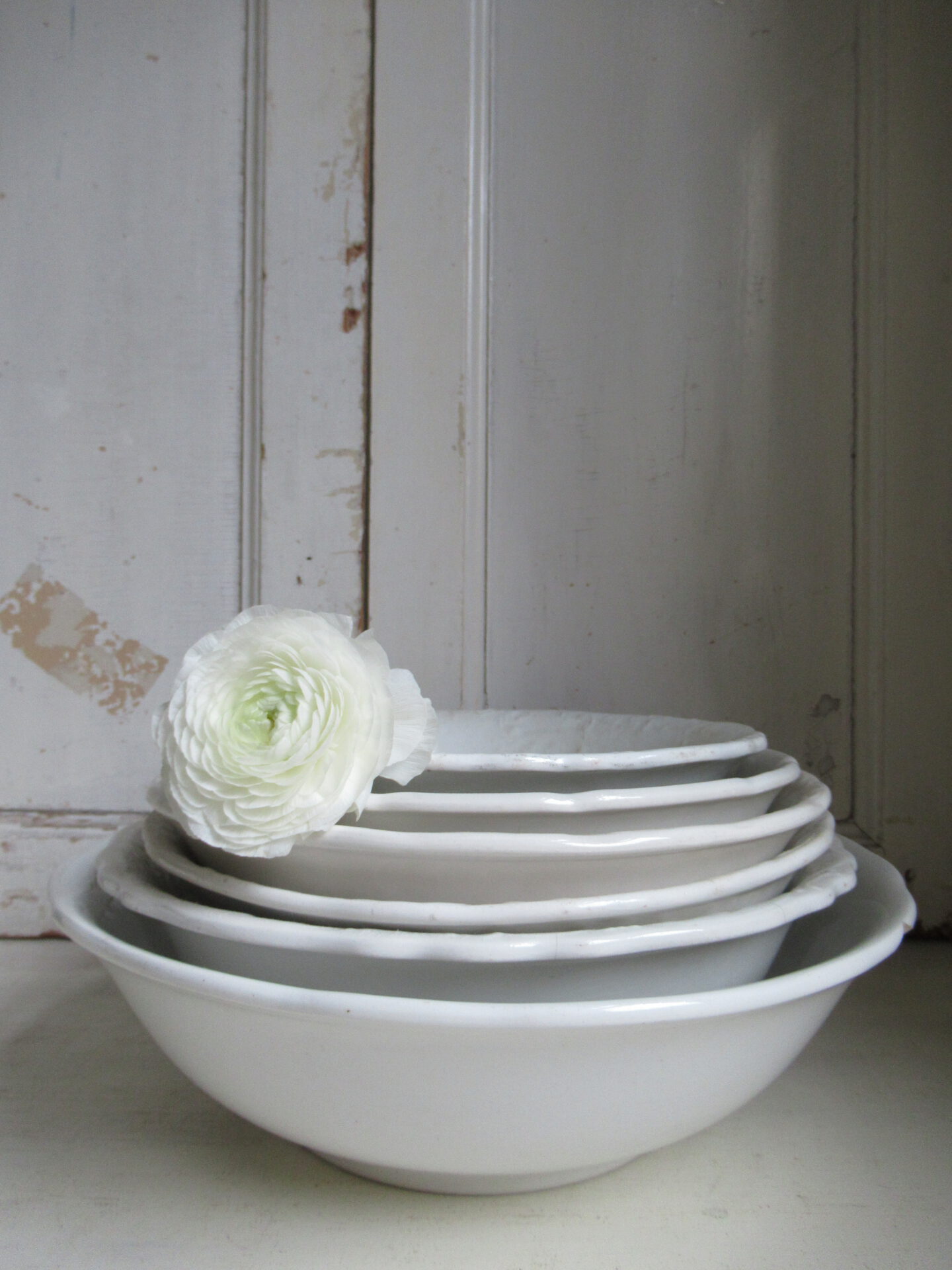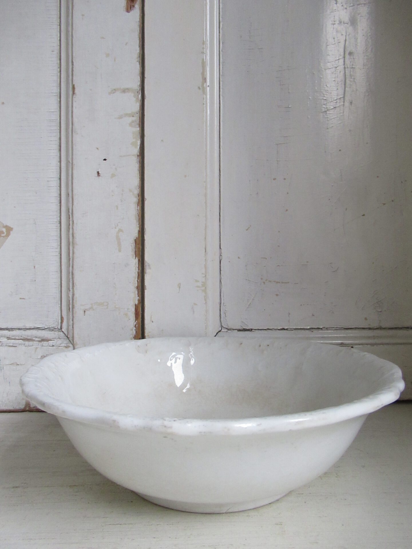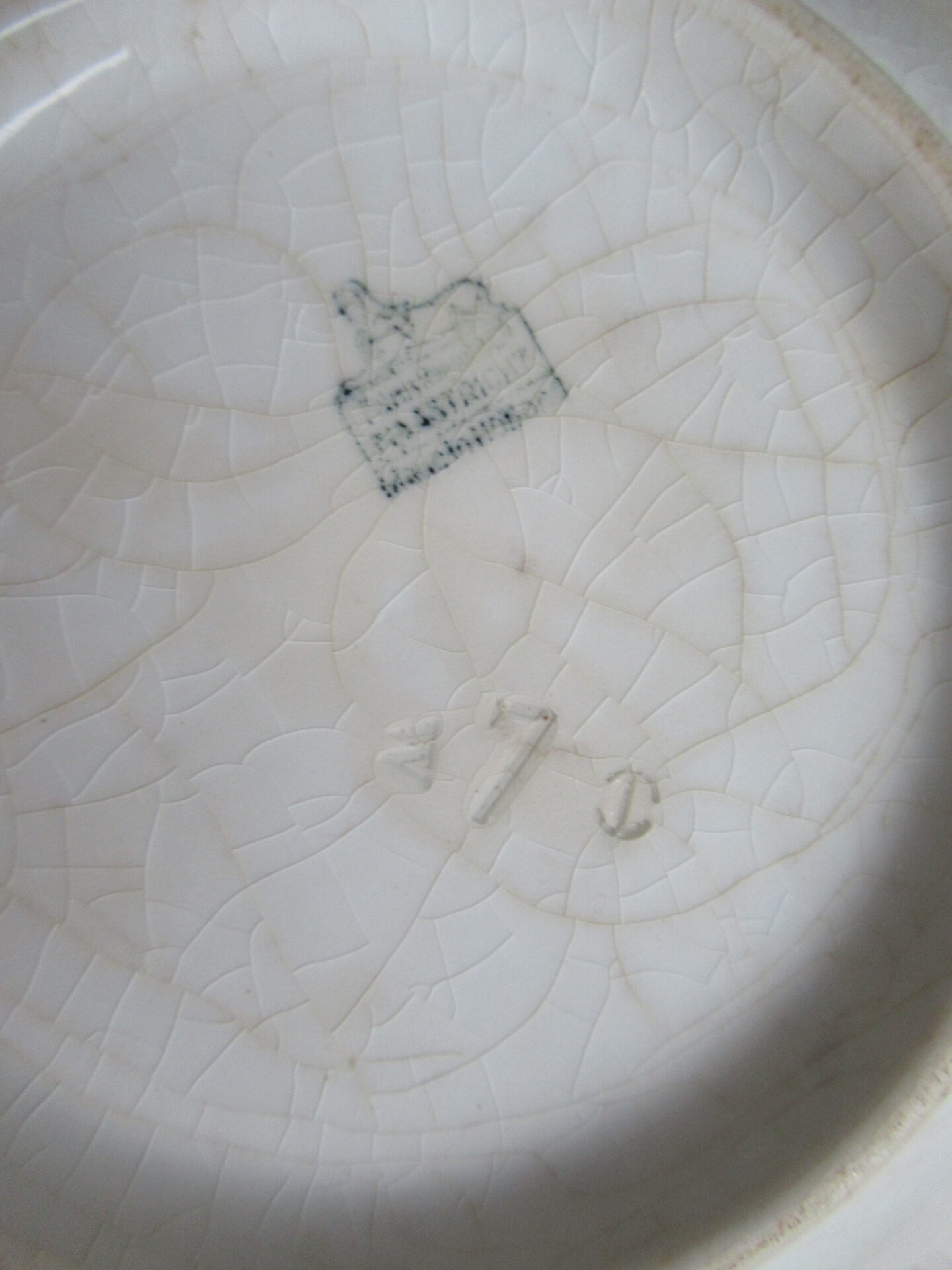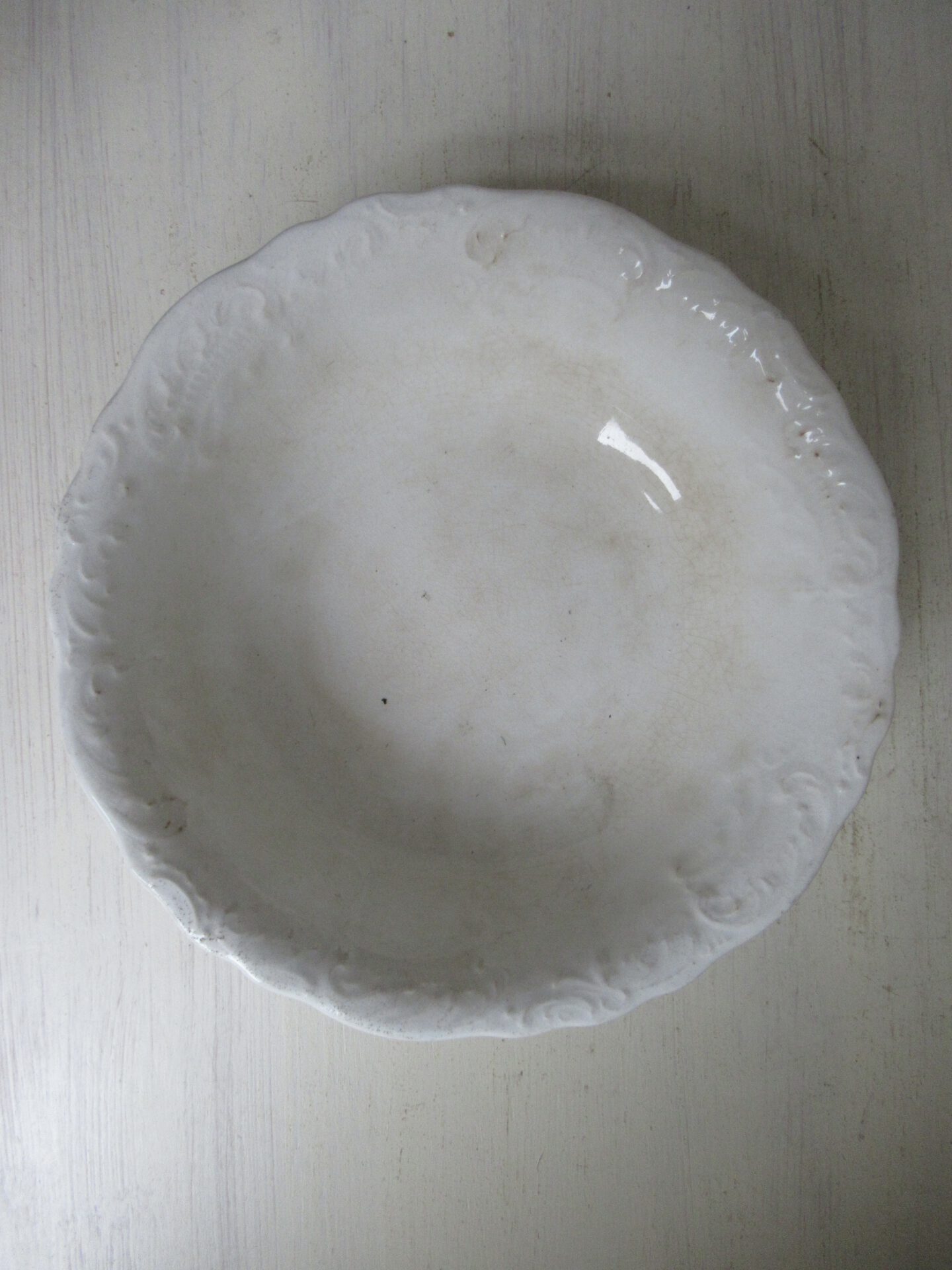 oude kleine schaal, Petrus Regout, heeft duidelijke gebruikerssporen, maar geen stukjes af, licht beboterd (doorsnede 23 cm, hoogte 6,5 cm)
