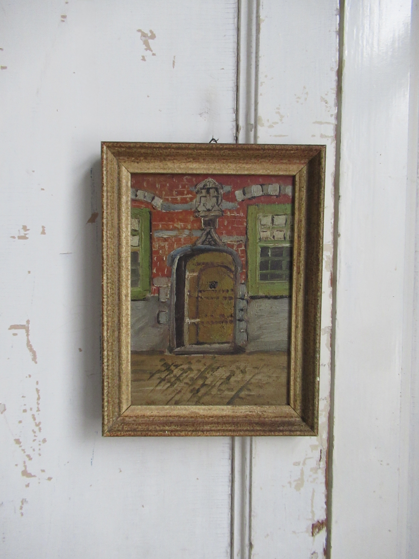 oude lijst met afbeelding achter glas, prachtige kleuren, lijst mist hier en daar een stukje en is volgens mij met goudverf bijgewerkt, niet storend vind ik, kan hangen (36 bij 31 cm)