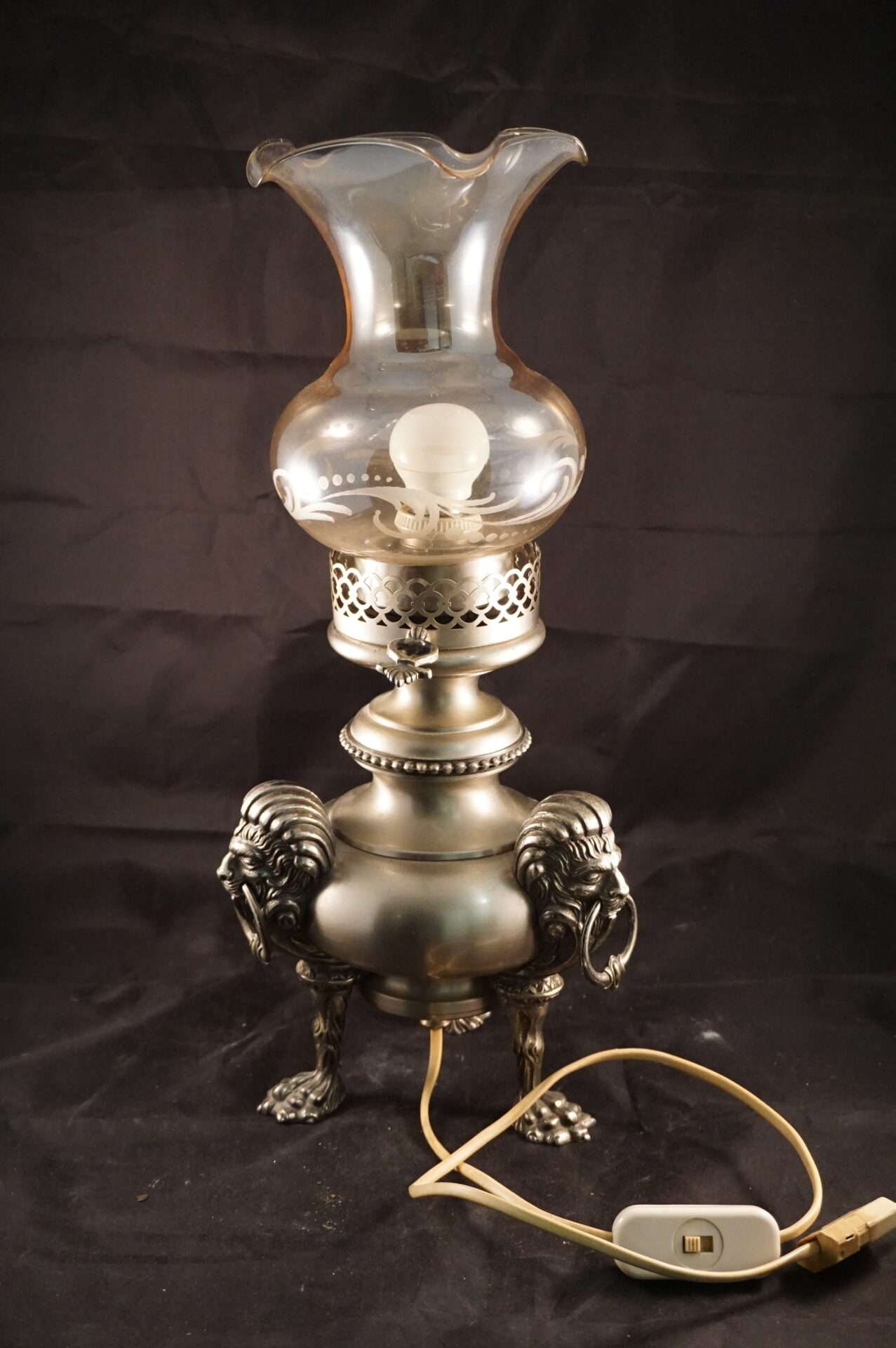 Oude metalen tafellamp met een sierlijk ontwerp, inclusief leeuwenkoppen en -poten. Het heeft een glazen kap en een gloeilamp, en het is aangesloten op een modern elektrisch snoer met een schakelaar.