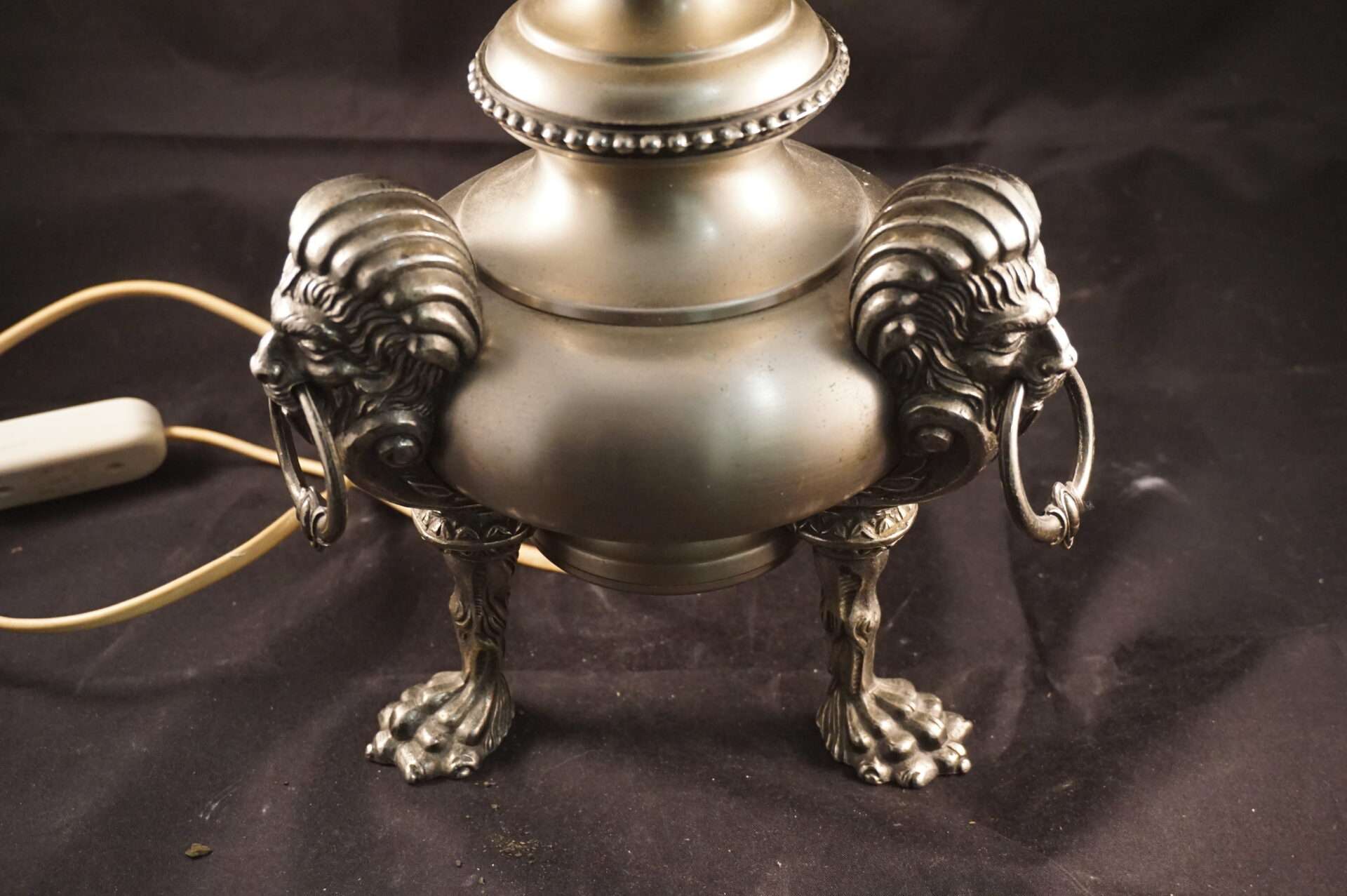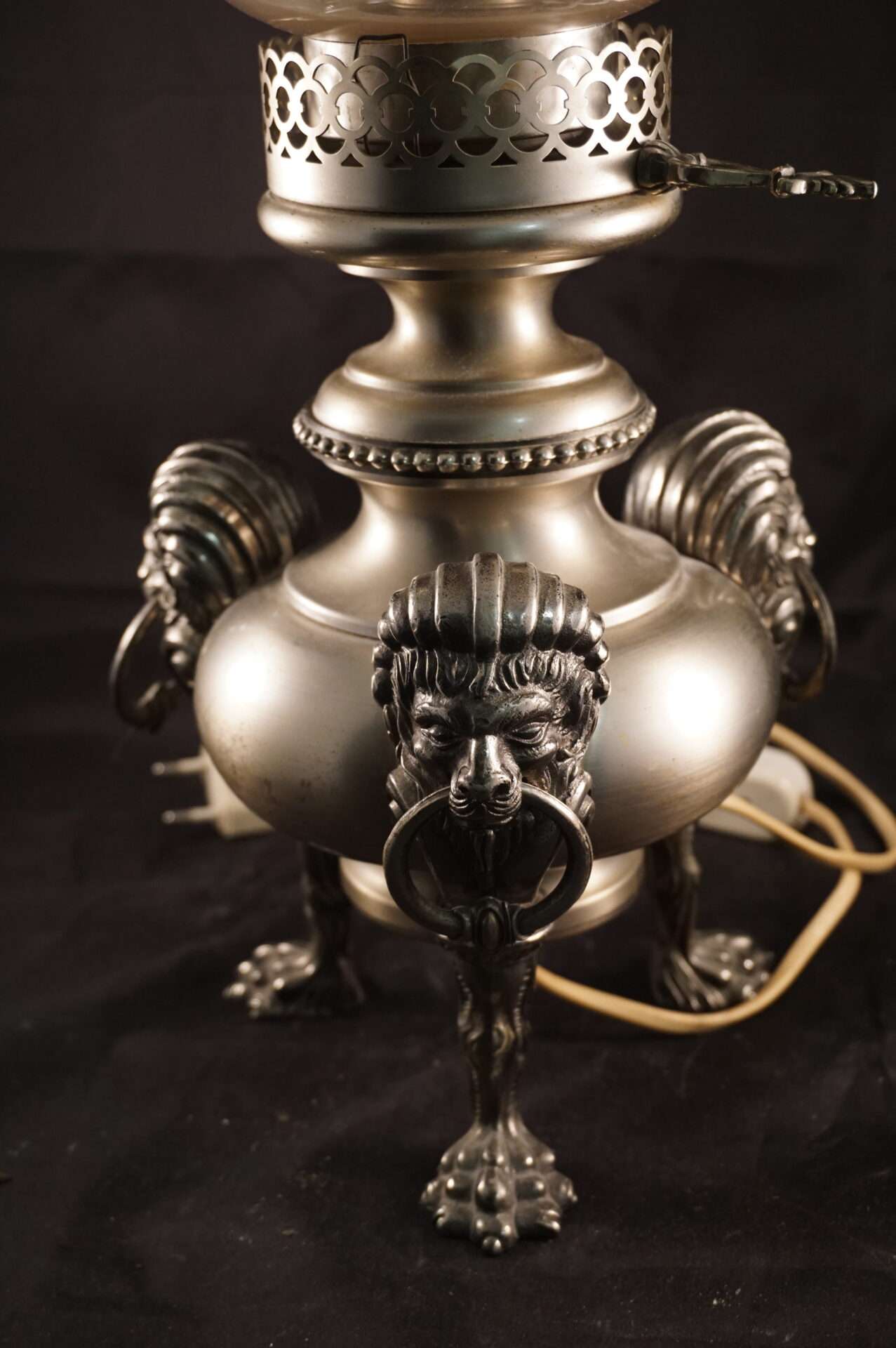 Oude metalen tafellamp met leeuwenkoppen en leeuwenpoten