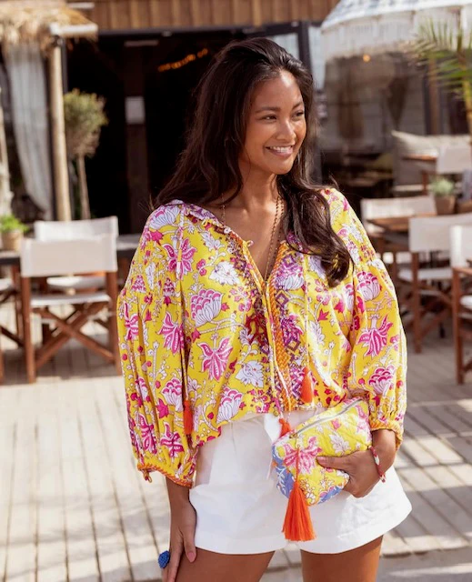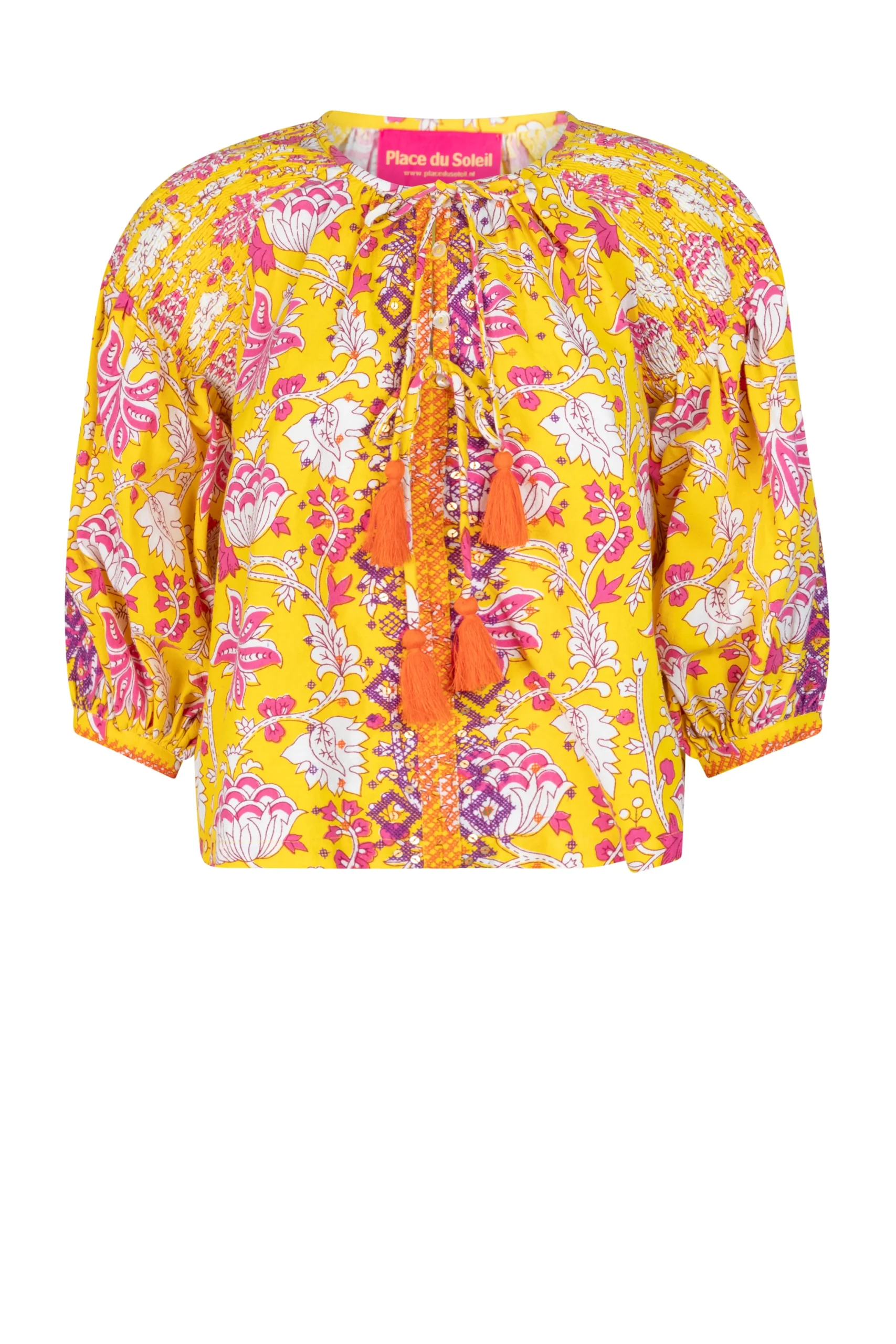 Blouse Yellow Print Purple Embroidery van Place du Soleil. De blouse is een licht klokkend model met 3/4 mouwen met manchet en heeft werkelijk prachtige borduursels in paars en oranje met pailletten. Blouse top heeft 4 knoopjes en strikkoord met oranje flosjes. Deze geweldige blouse is in de kleurencombinatie geel, paars, oranje.