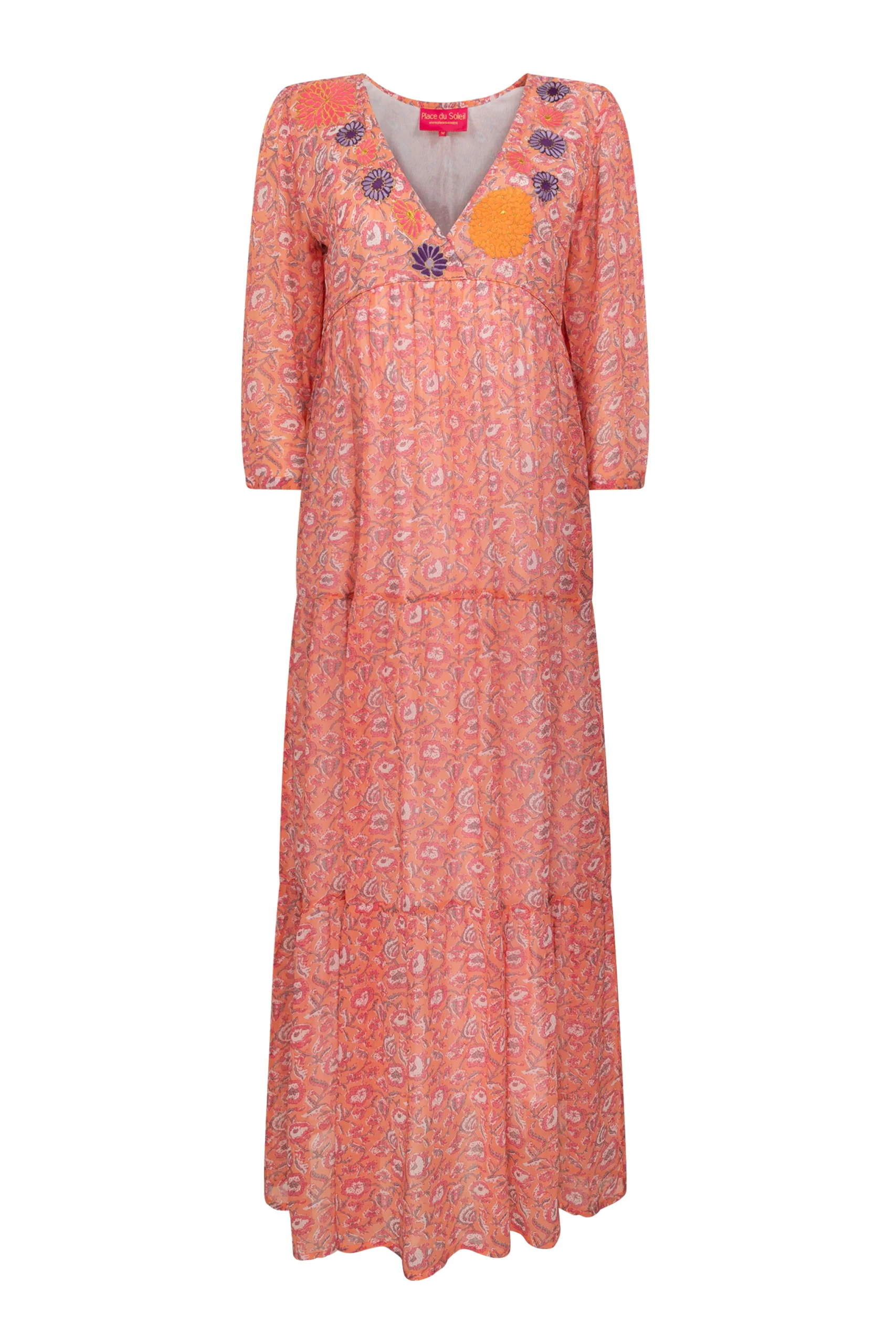Jurk van Place du Soleil, Floral Maxi is een prachtige lange jurk met onderjurk en 3/4 mouwen. De jurk heeft mooie applicaties bloemen en een V-hals.