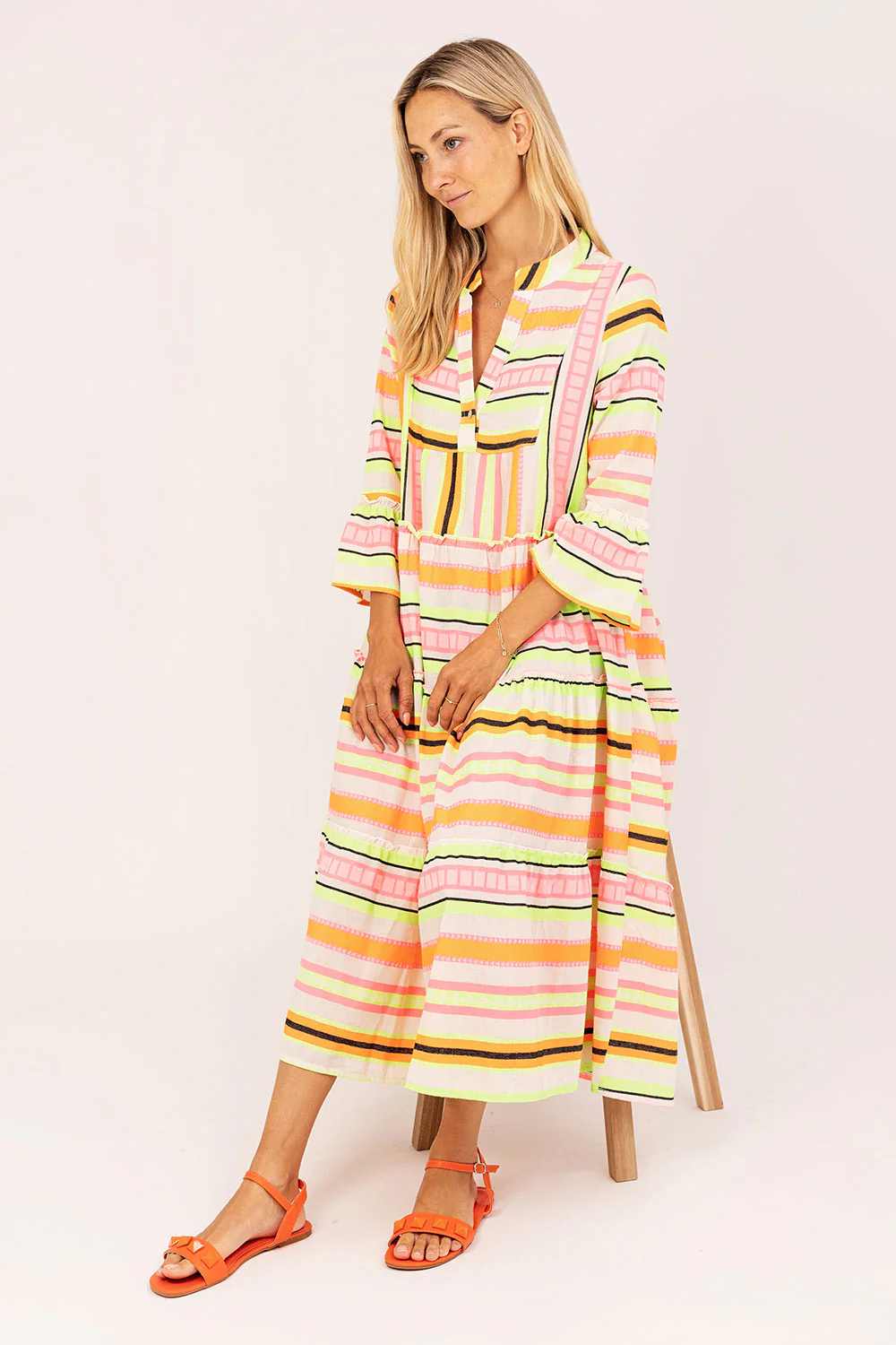Jurk van Place du Soleil, Palm Maxi is een maxi dress met verstelbare strikjes met fluo gekleurde flosjes, heeft een V-hals met strik en een strook onderaan de jurk. Deze prachtige zomerjurk voorzien van palmbomen, draagt heerlijk door het katoen en heeft een onderjurk.