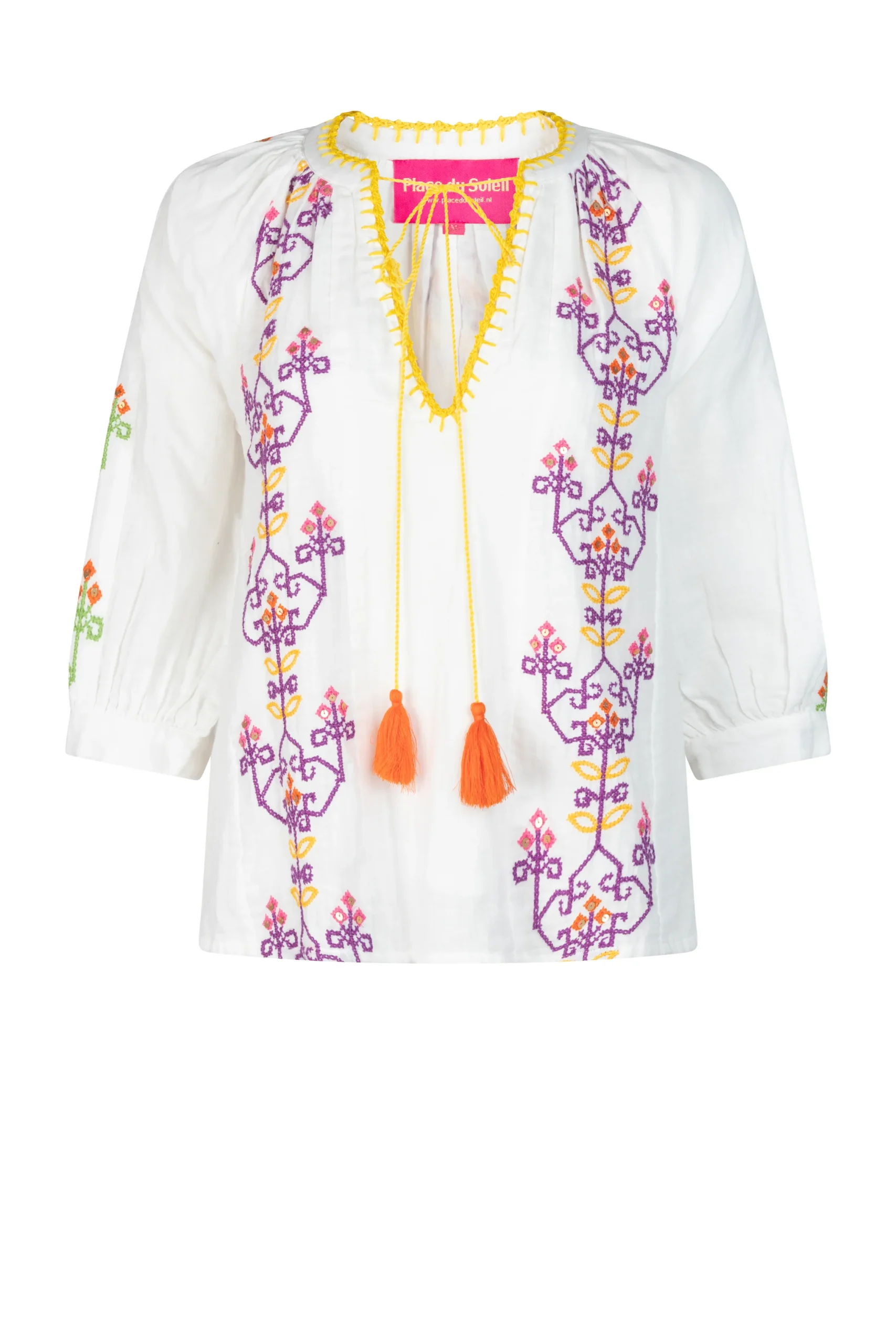 Top Cotton White Purple Embroidery van Place du Soleil. De top is gevoerd, is een licht klokkend model met 3/4 mouwen en manchet. Deze geweldige blouse is in de prachtige kleuren combinatie wit, paars, geel en heeft kleine pailletten. Op de mouwen dezelfde borduursels in de kleuren combinatie groen, roze, oranje. Top heeft een geborduurde geel kleurige boord met V-hals, strikkoord en oranje flosjes.