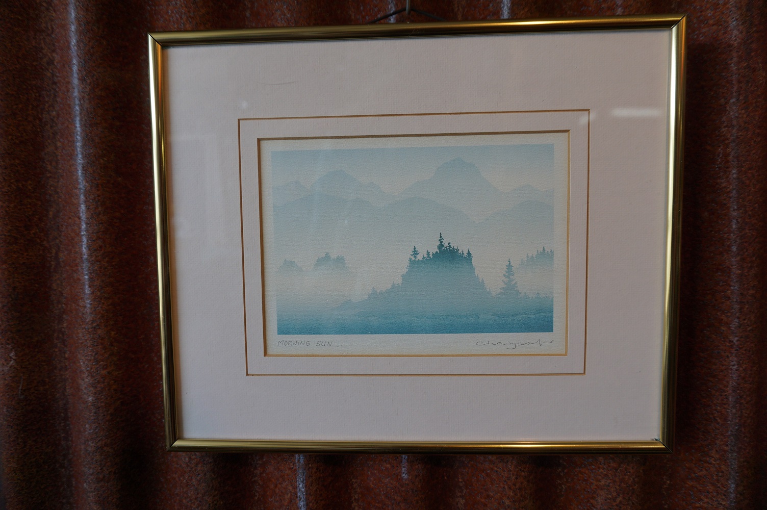 Prachtige print de “morning sun” by Peter en Traudl Warkgraf. Gesigneerd. Ingeslijsd met paspartoe. Afmeting: 34 cm breed en 28.5 cm hoog. Binnenmaat paspartoe: 20 cm breed en 14 cm hoog.