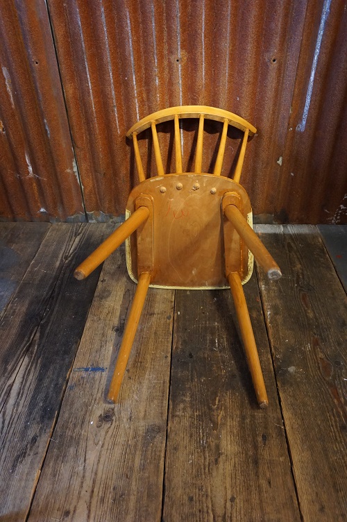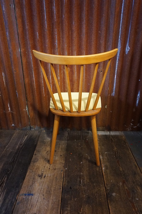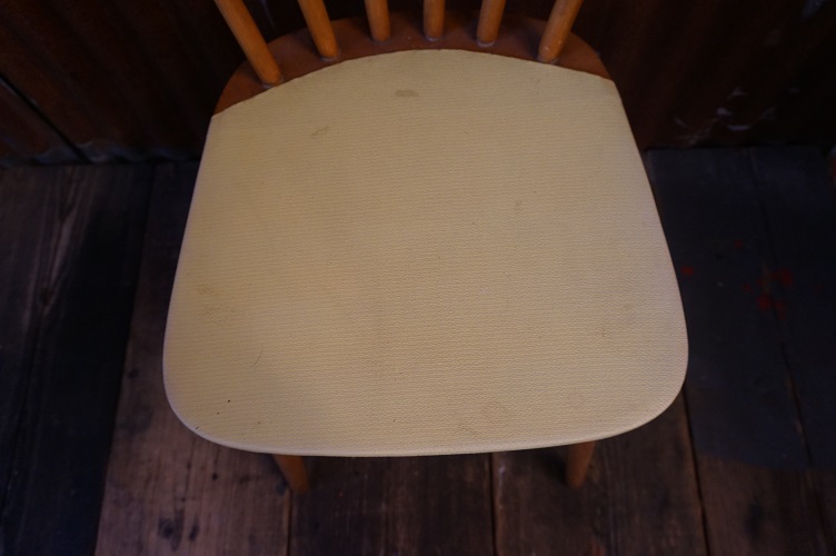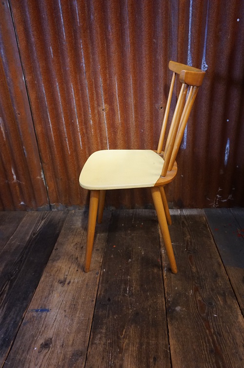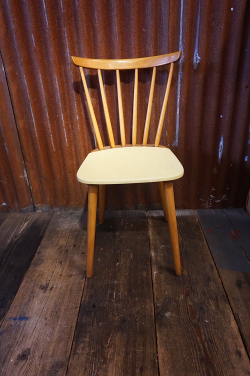 Retro houten spijlenstoel met gele kunststof zitting. Afmeting stoel: 48 cm breedste gedeelte, 40.5 cm diepste gedeelte en 80 cm hoog. Zithoogte is 44 cm. Alle drie in goede staat. Prijs is per stoel.
