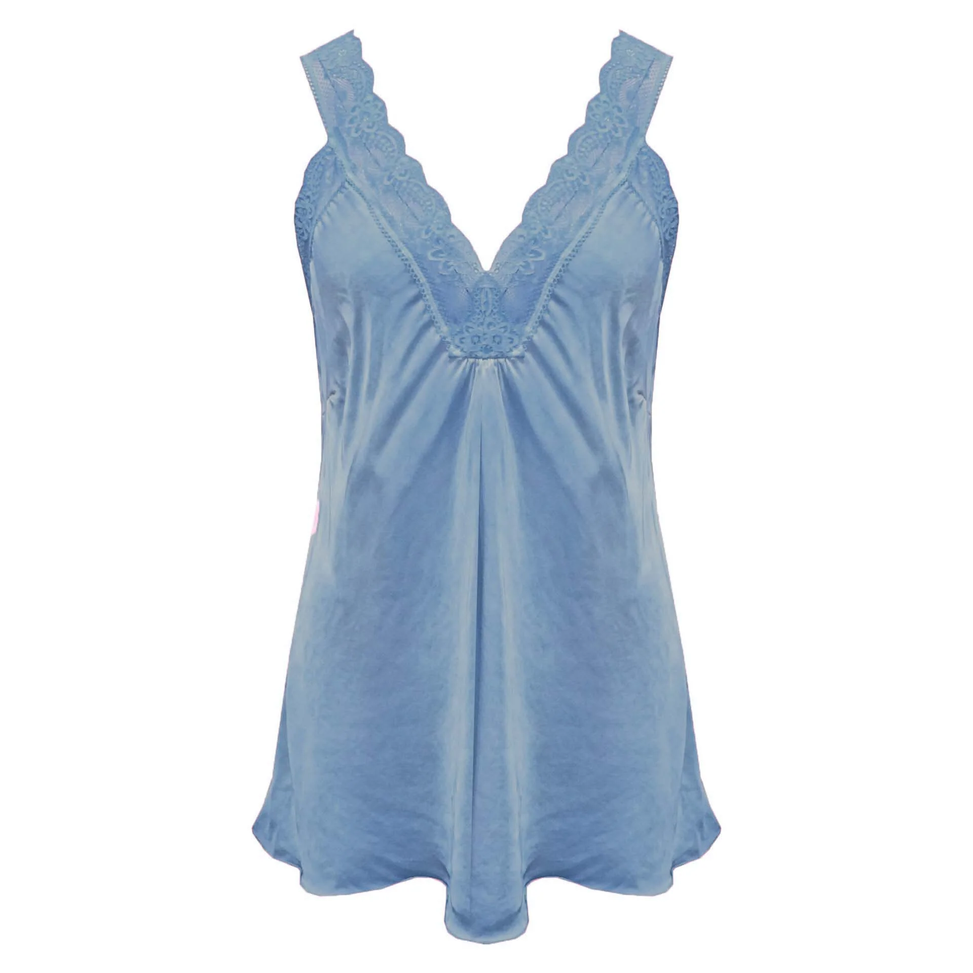 Mooi satijnen singlet / hemd met kant. Deze top is tijdloos en kan het gehele jaar door gedragen worden. Het achterpand is voorzien van elastiek. Deze top is verkrijgbaar in verschillende kleuren: Antraciet, Paars, Wit, Kobalt, Navy, Jeansblauw, Fuchsia, Lichtgroen, Geel, Zwart.