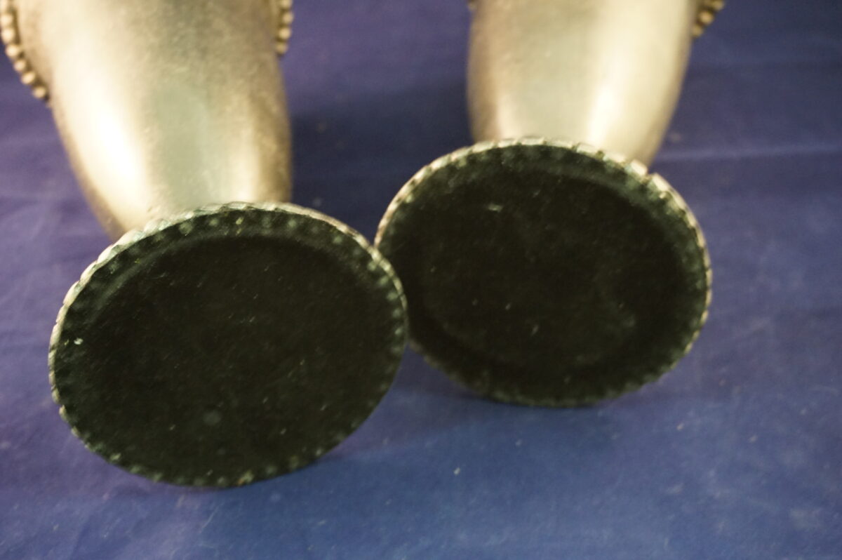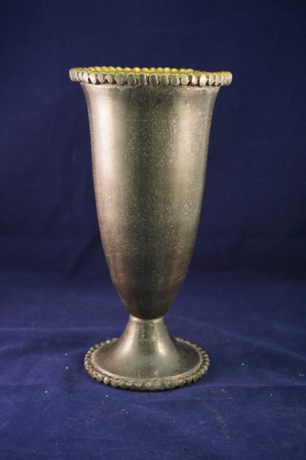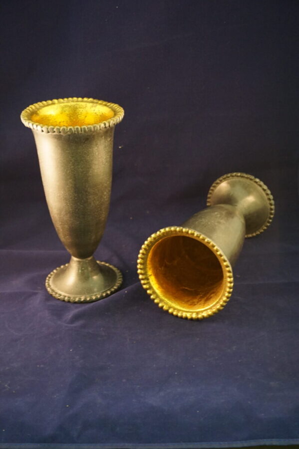 Lodsh set van nog 3 vazen. Metaal look met gouden binnenkant. Vazen met voet. Mooi afgewerkt randje aan bovenzijde en onderzijde. Conditie: als nieuw. Grote vaas is 27 cm hoog met doorsnede van 14 cm en de kleine vaas heeft een afmeting van 20 cm hoog met doorsnede van 11 cm. Setprijs Twee groot, één klein € 50,00.