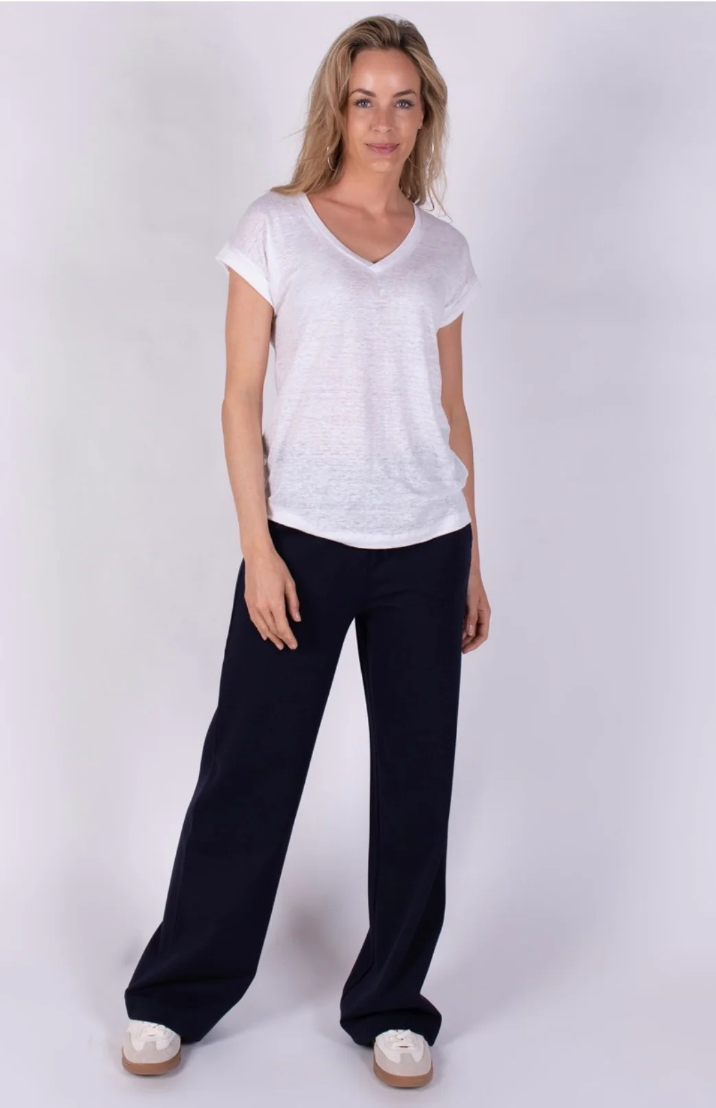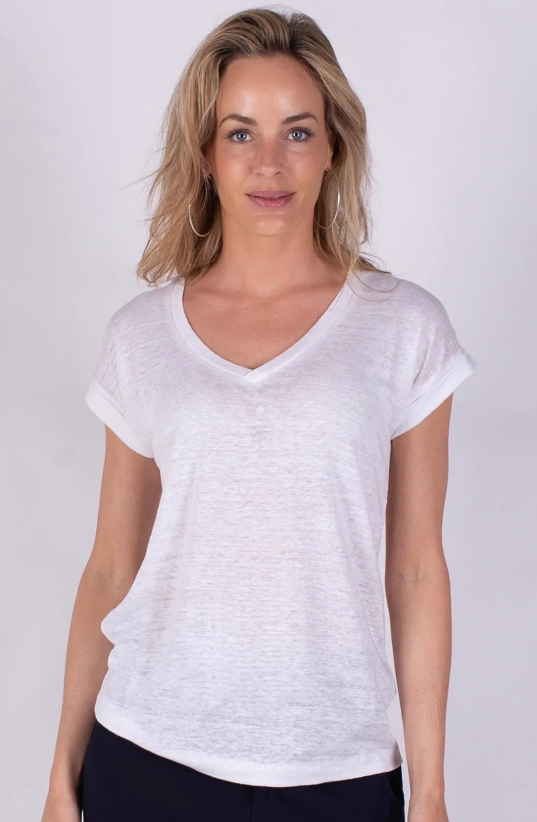 Een comfortabel T-shirt met een diepe V-hals en relaxte pasvorm. Gemaakt van hoogwaardig, ademend linnen – perfect voor zomerse dagen.