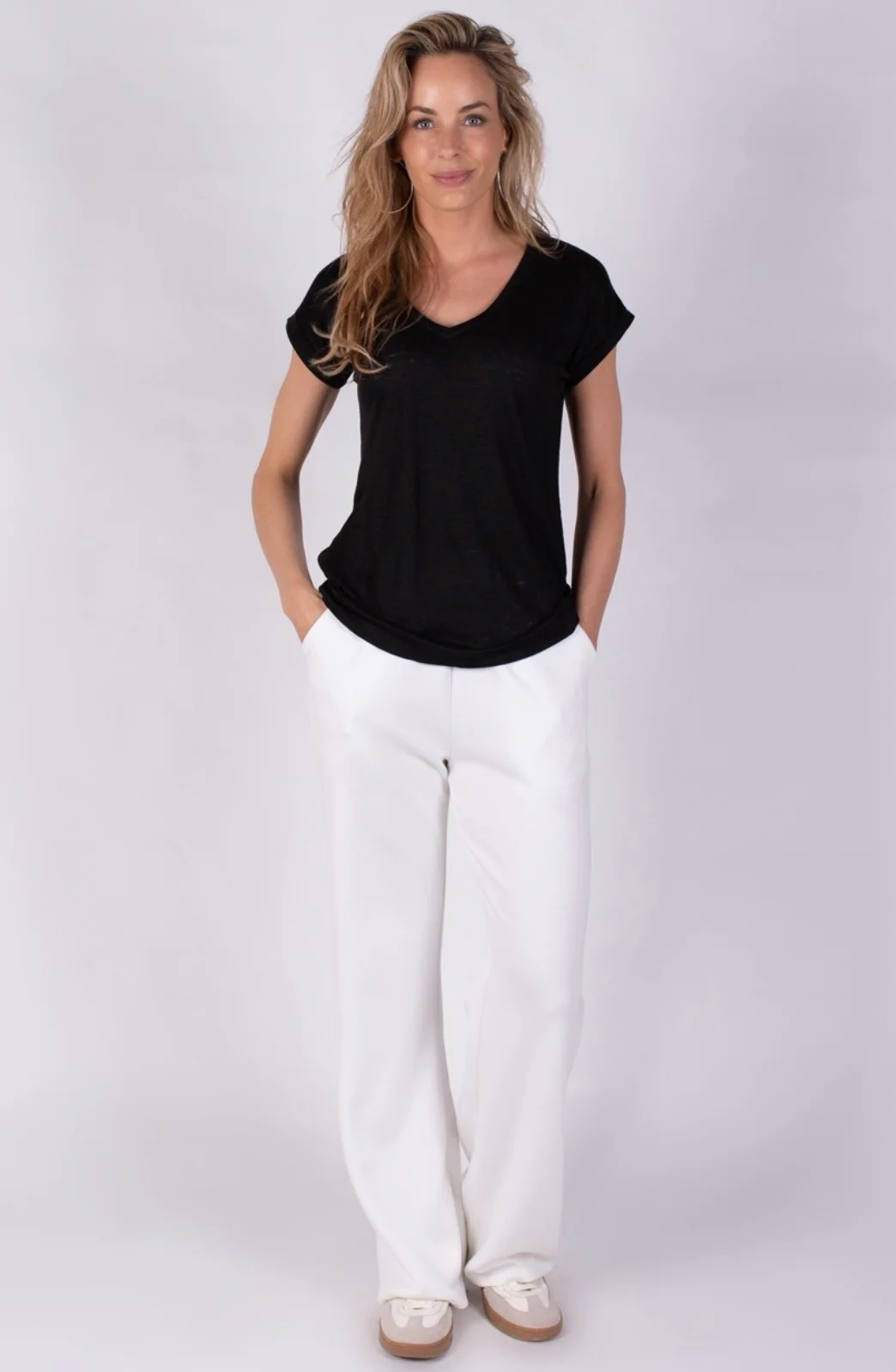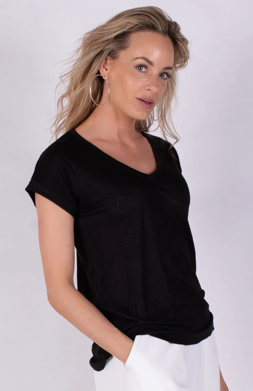 Een comfortabel T-shirt met een diepe V-hals en relaxte pasvorm. Gemaakt van hoogwaardig, ademend linnen – perfect voor zomerse dagen.