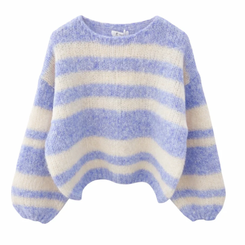 Dunne trui met hoge kraag, pofmouwen met brede manchetten. De trui heeft gouden knopen op de schouders en ribgebreide boorden. De trui is verkrijgbaar in gecombineerde maten: S/M en M/L.