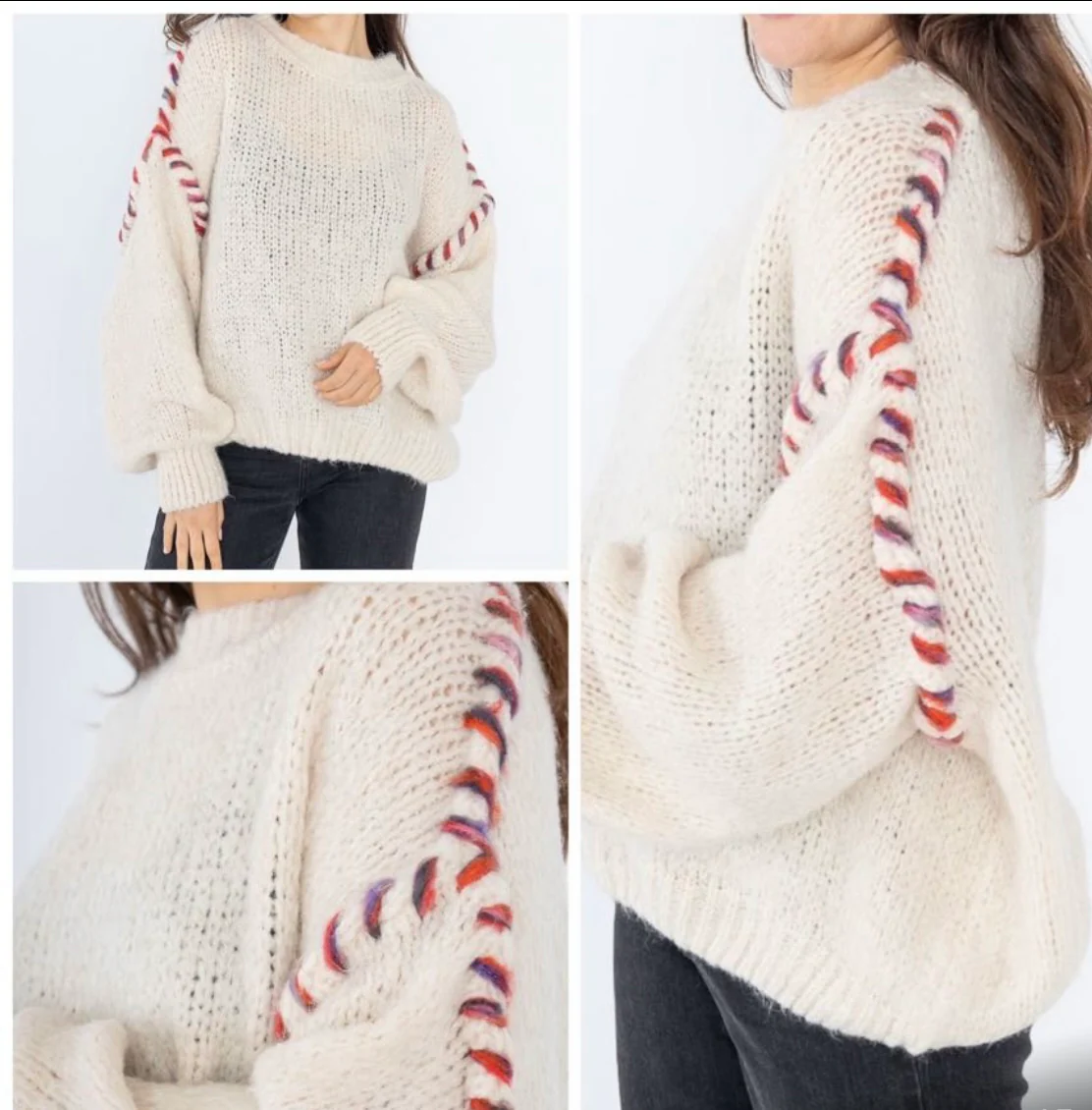 Beige Trui grofgebreid met een turtleneck, prikt niet en heeft een gekleurd detail als naad. De trui is verkrijgbaar in one size, draagbaar voor maat S t/m XL en is verkrijgbaar in verschillende kleuren: Beige/roze, Beige/brique.