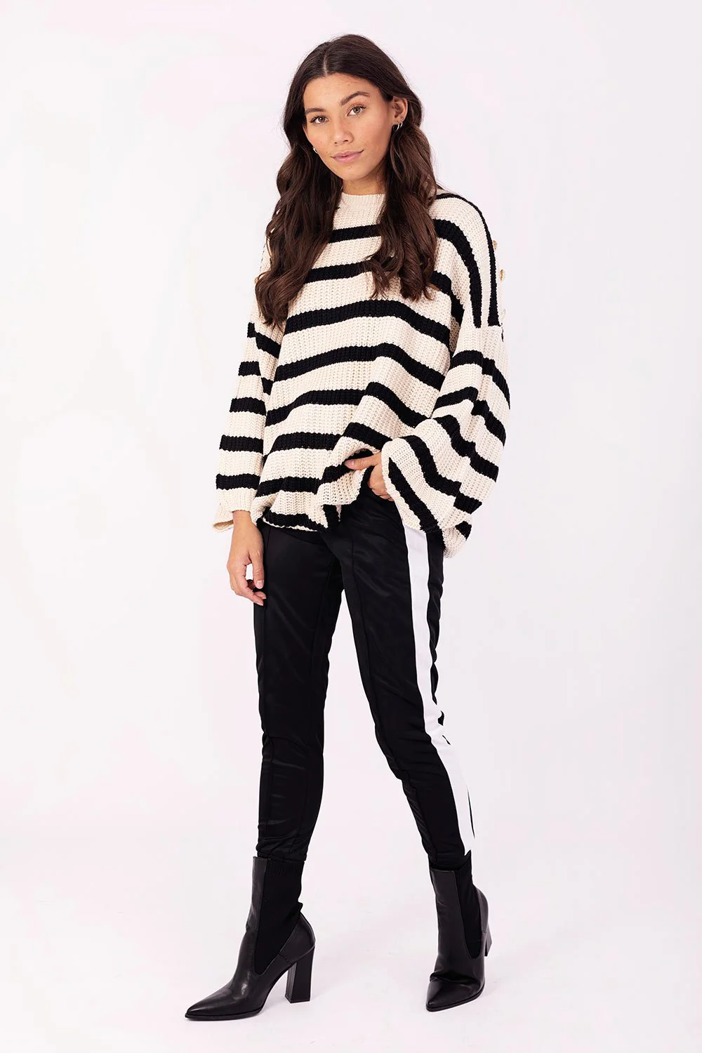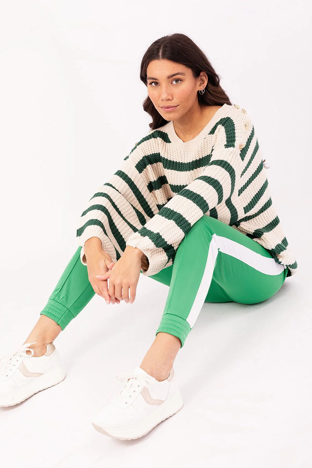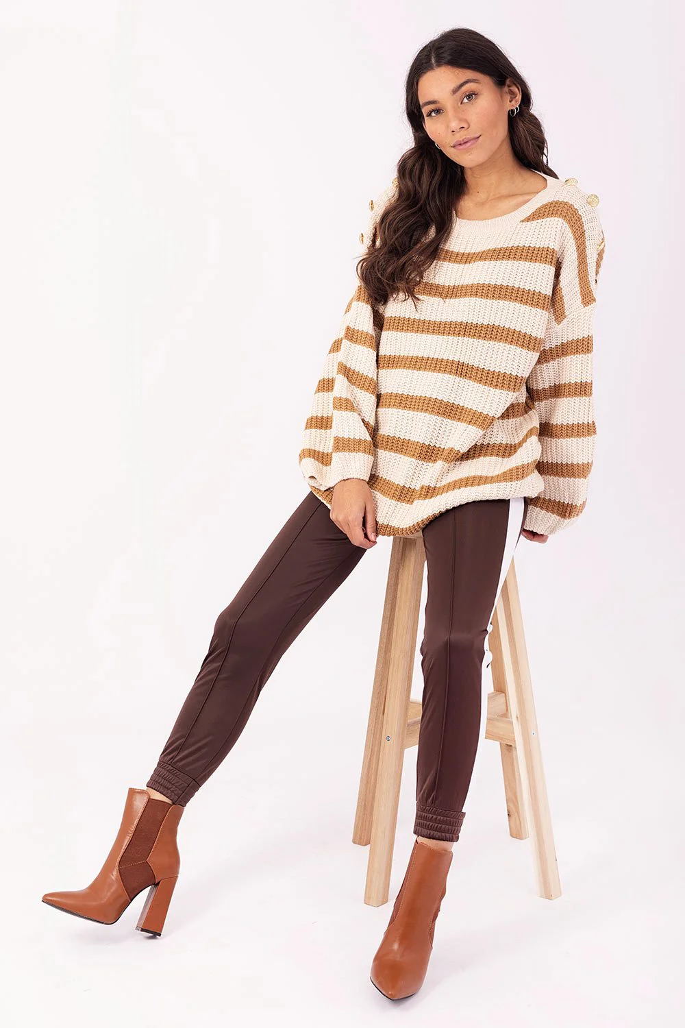 Een heerlijke wijde grof gebreide gestreepte trui, met als leuk detail goudkleurige knopen op weerszijde schouders en een ronde hals. Deze trui is verkrijgbaar in verschillende kleuren: groen/ecru, camel/ecru.