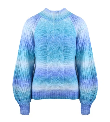 Trui Rain Turquoise/kobalt is een trendy grof gebreide trui met lange pofmouwen, een opstaande kraag en heeft een kabelpatroon op het voorpand. De trui is gemaakt van multicolor garen en is verkrijgbaar in één maat, draagbaar voor maat S/M/L en is verkrijgbaar in verschillende kleuren: Turquoise/kobalt, Roze/geel.