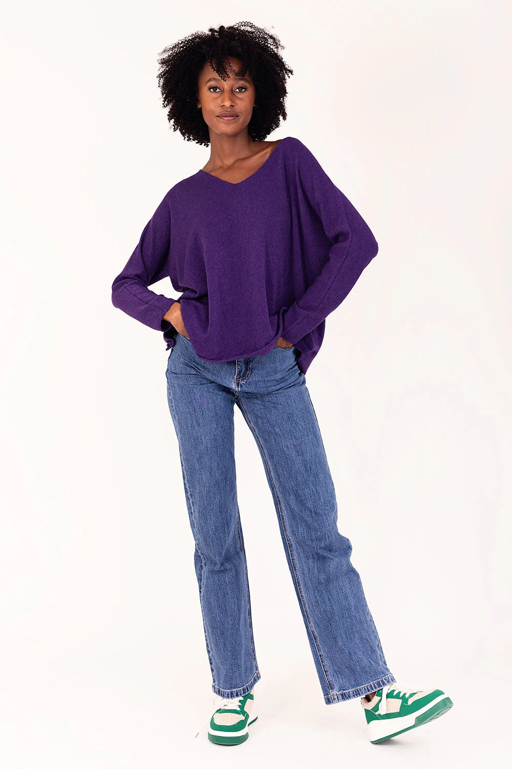 Trui met V-hals en lange mouwen is een heerlijk wijde zachte trui. Deze trui is verkrijgbaar in verschillende kleuren: paars, camel, brique.
