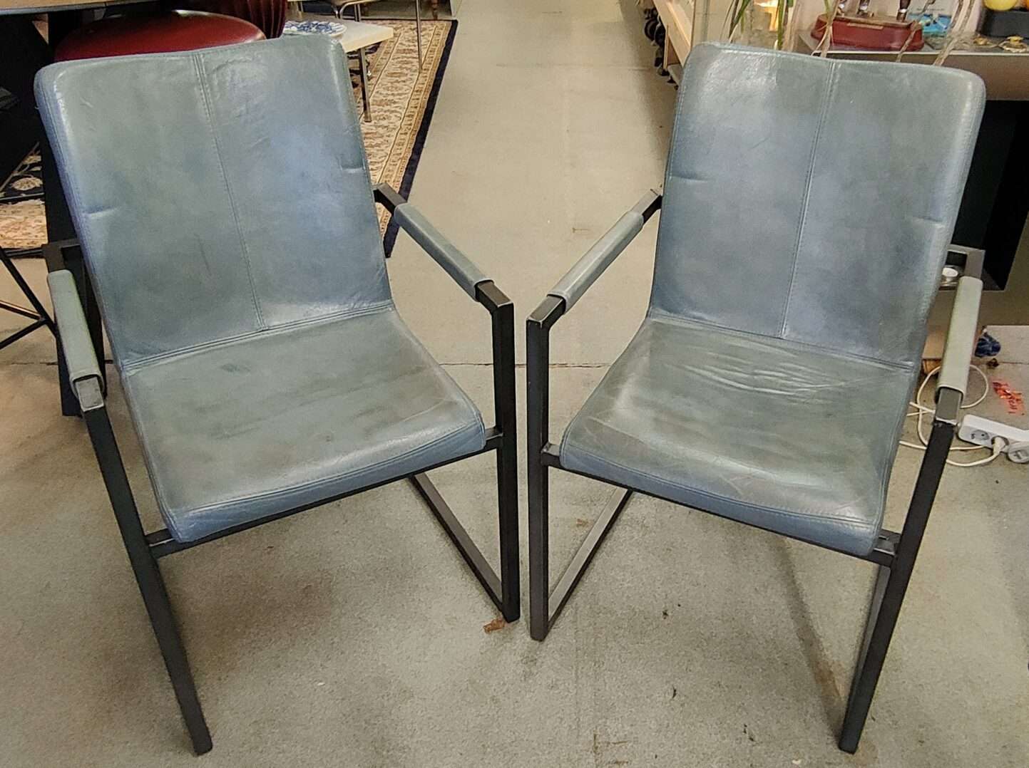 Twee moderne industriële stevige sledestoelen met armleuning. Onderstel is van zwart metaal en de bekleding van geleefd grijskleurig gemêleerd leder. De stoelen zijn gebruikt, maar verkeren in goede staat.