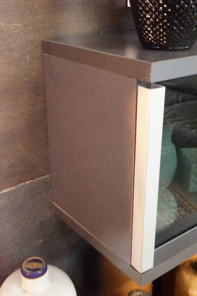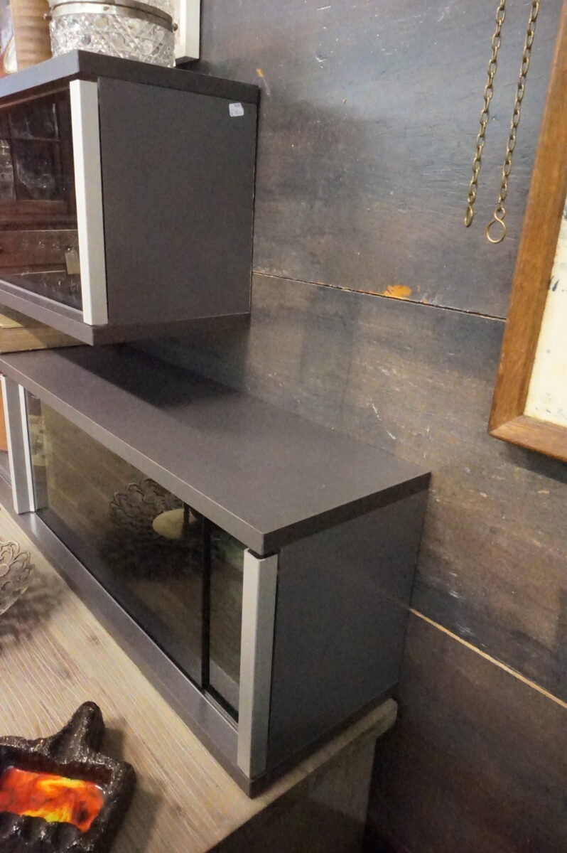 Moderne langwerpige wandkasten met glazen schuifdeuren. Kleur is grijs met chromen elementen en donkergekleurd glas. Gebruikt, maar in goede staat. Bij 1 zit een kring aan bovenzijde, maar die is bijna niet te zien. De kastjes zijn makkelijk op te hangen. Afmeting per kast: 97 cm breed, 20 cm diep en 26 cm hoog.