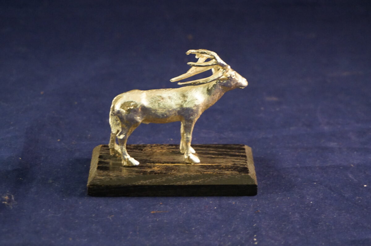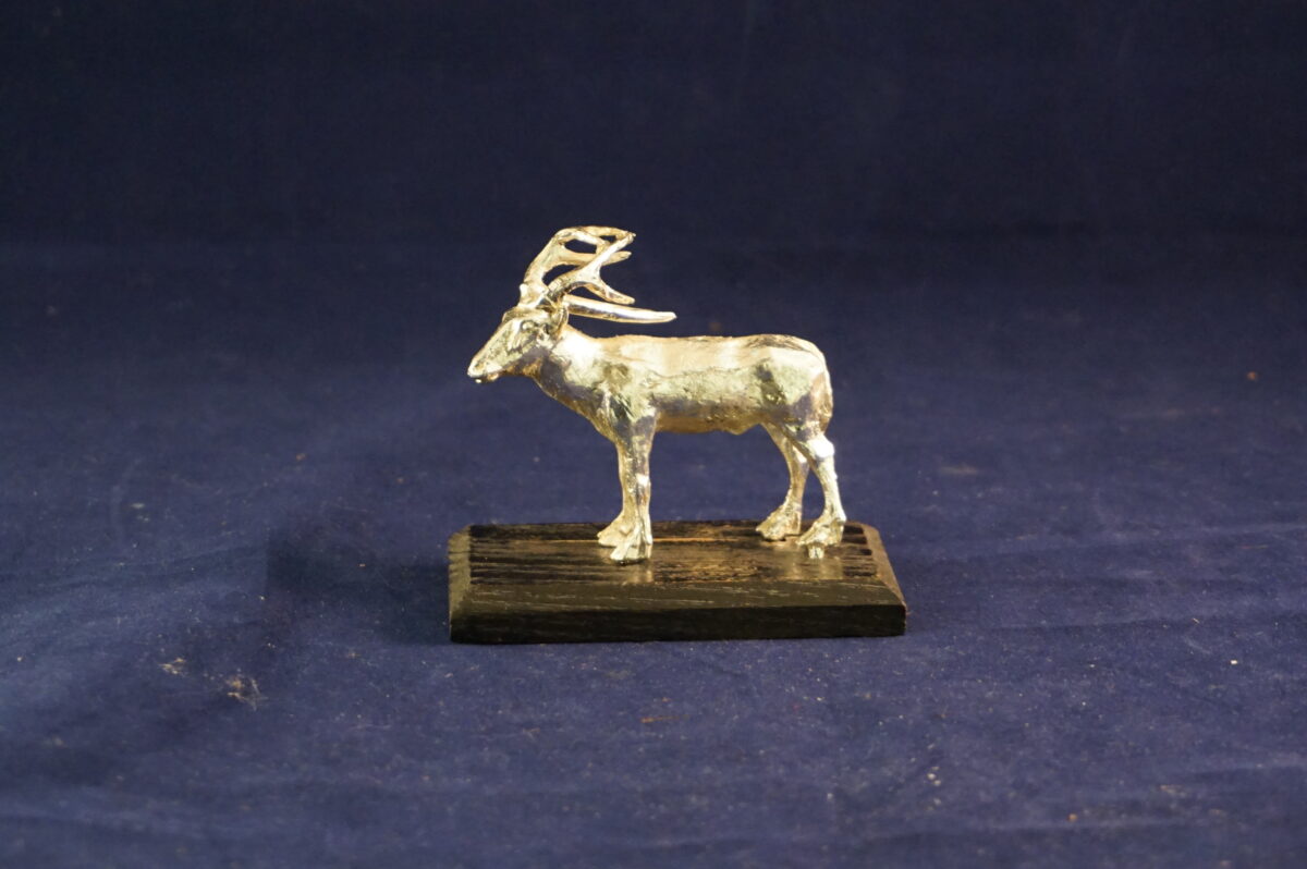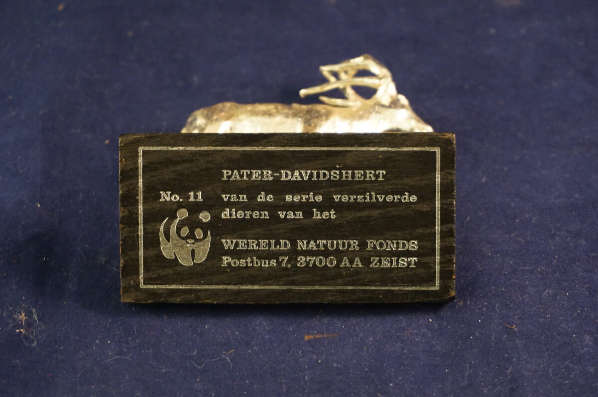 Verzilverde miniatuur beeldje van het Wereld Natuur Fonds (WNF) – uit de serie “verzilverde dieren van het Wereld Natuur Fonds” – jaren 80. Pater Davidshert. Afmeting: 8.5 cm breed, 4.5 cm diep en 7 cm hoog. Het beeldje zit los op houten sokkel.