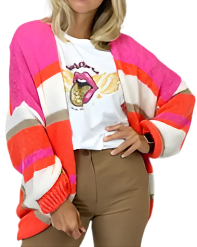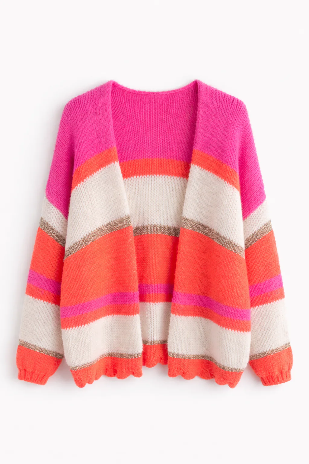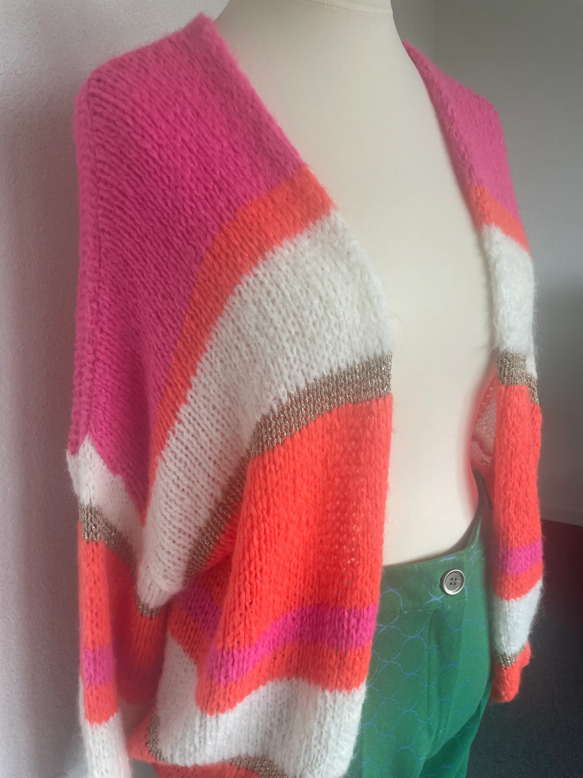 Vest Jool is een grof gebreid vest met strepen in de fluo kleuren oranje en fuchsia, ecru en goudkleurig lurex draad. Vest is verkrijgbaar in één maat, geschikt voor S/M/L.