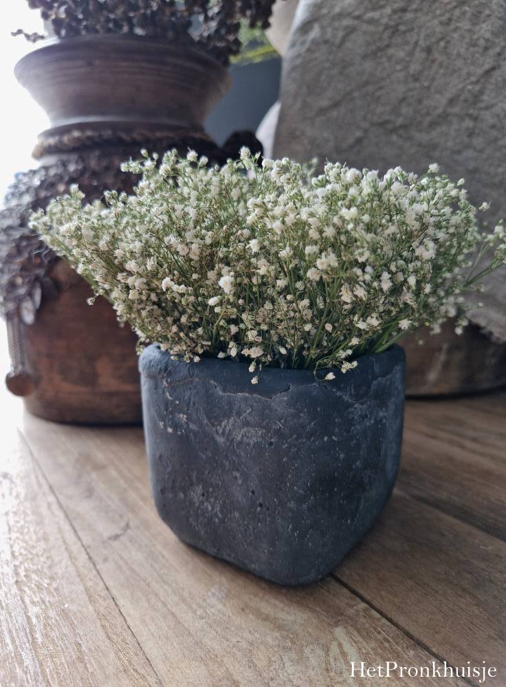 Vierkante pot in een donker grijze kleur.