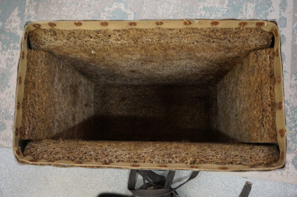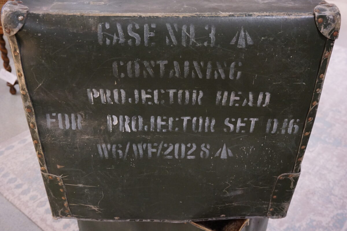 Leger kist. Case no.3 voor projector head D16. Geschikt voor de verzamelaar of iemand die het item wilt neerzetten als meubelstuk. Afmeting: ongeveer 60 cm breed, 55 cm hoog en 35 cm diep. De kist bestaat uit een deksel en een kist met aan de binnenzijde bekleding om de projector te beschermen. Er zitten spanbanden om de kist, waarvan 1 band ontbreekt.