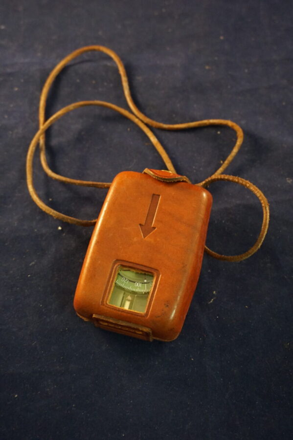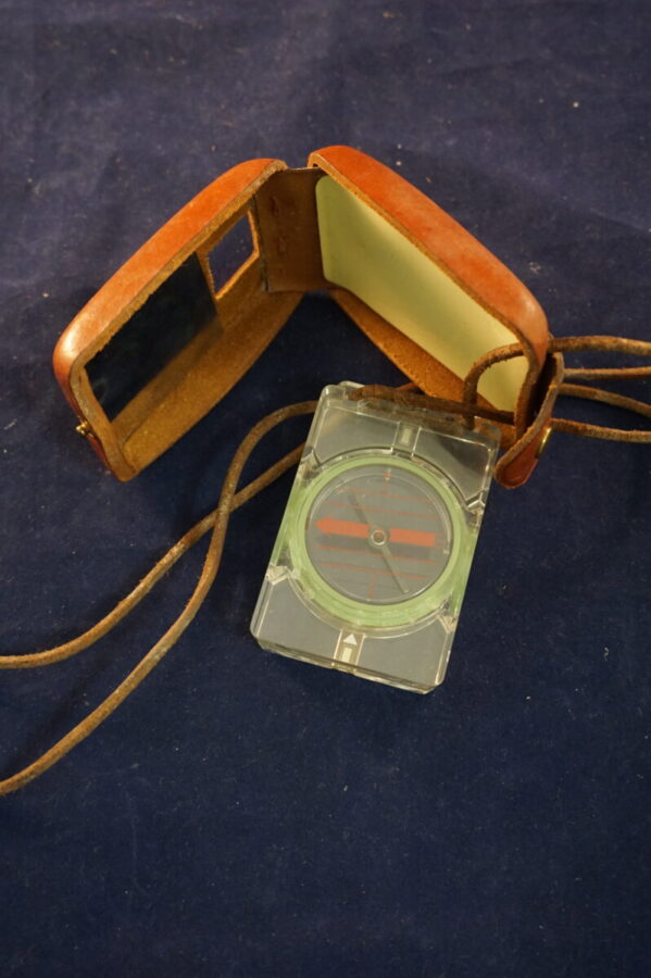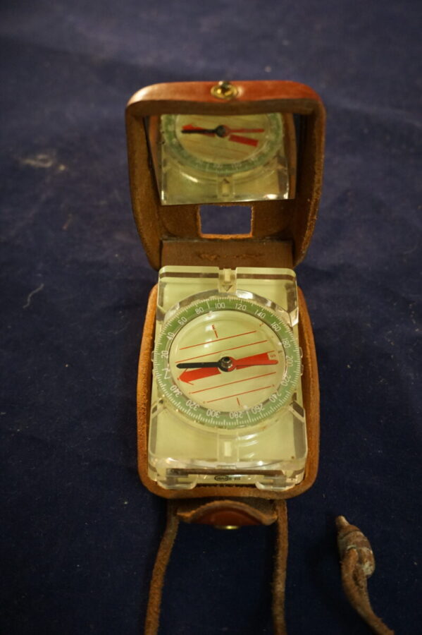 Vintage kompas in plexiglas met lederen etui. In zeer goede staat. Afmeting: 6.5 cm breed, 10 cm hoog en 3 cm diep.