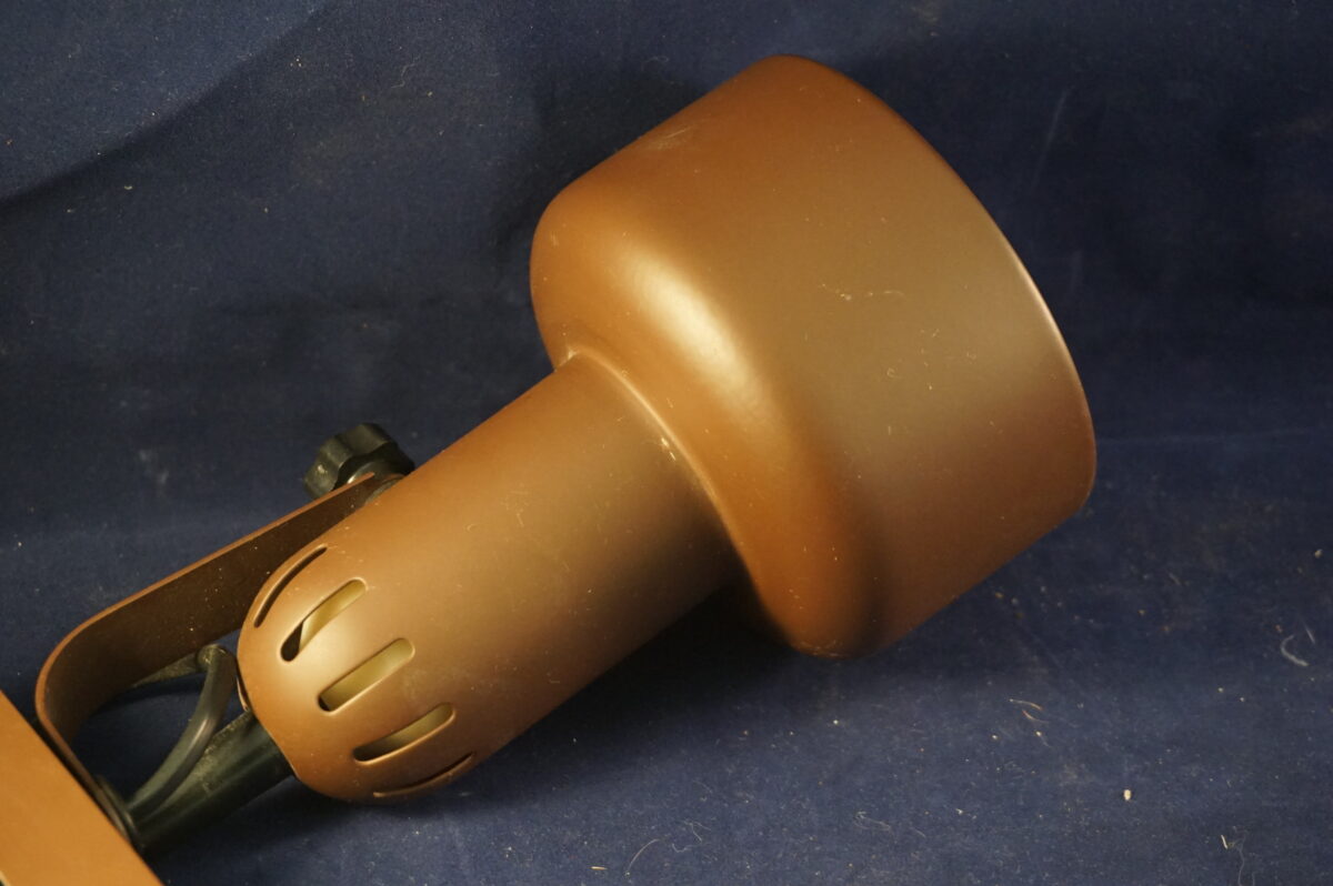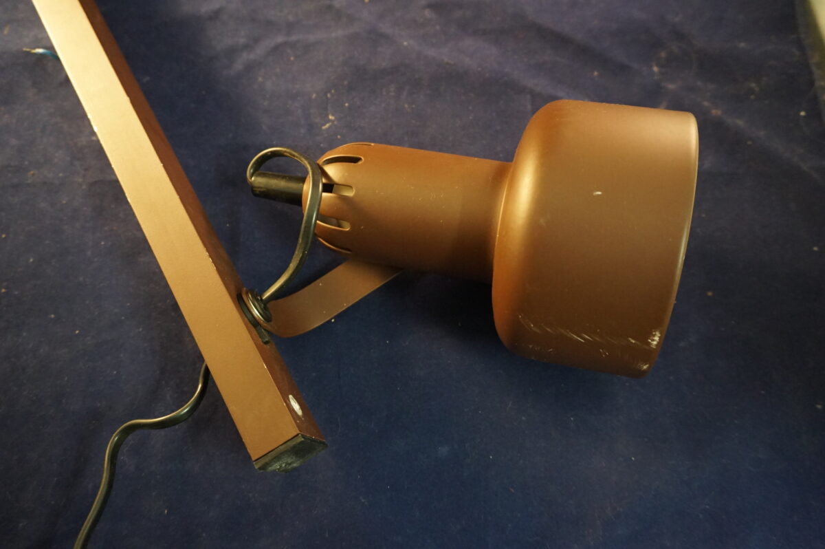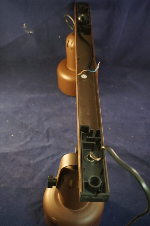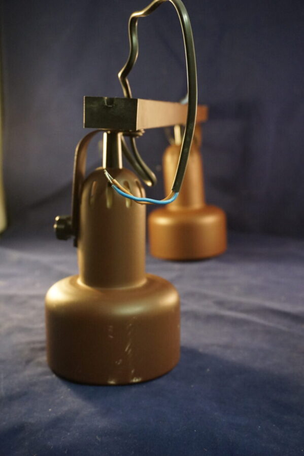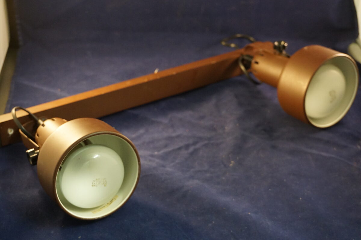 Vintage retro duo spot op muur/plafond armatuur. Werkend van muur gehaald. In goede vintage staat. De spot heeft een afmeting van 18 cm lengte met een doorsnede van 11 cm. Beide spots zitten op een muur/plafond armatuur van 49 cm lang. De spots zijn verstelbaar in richting.