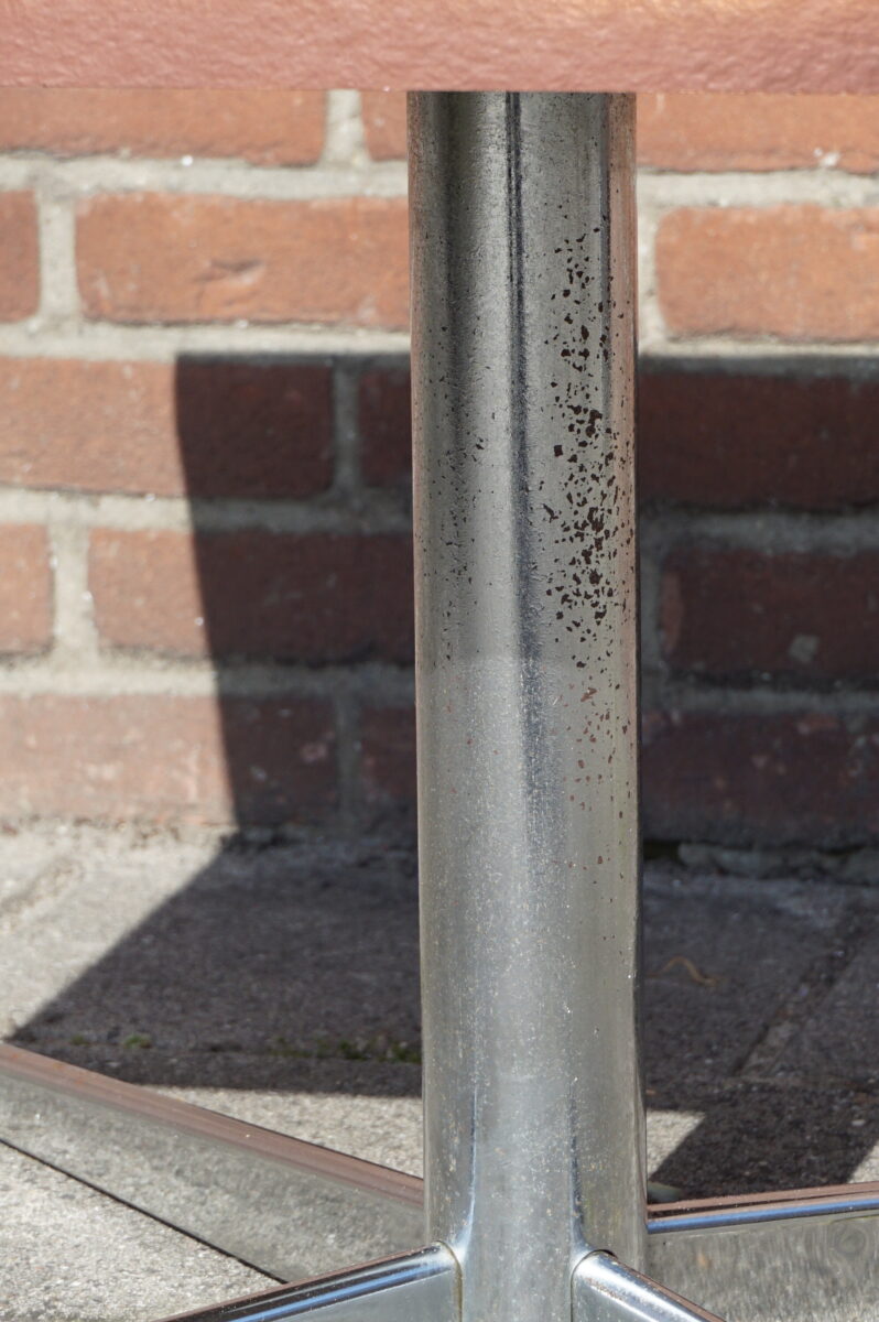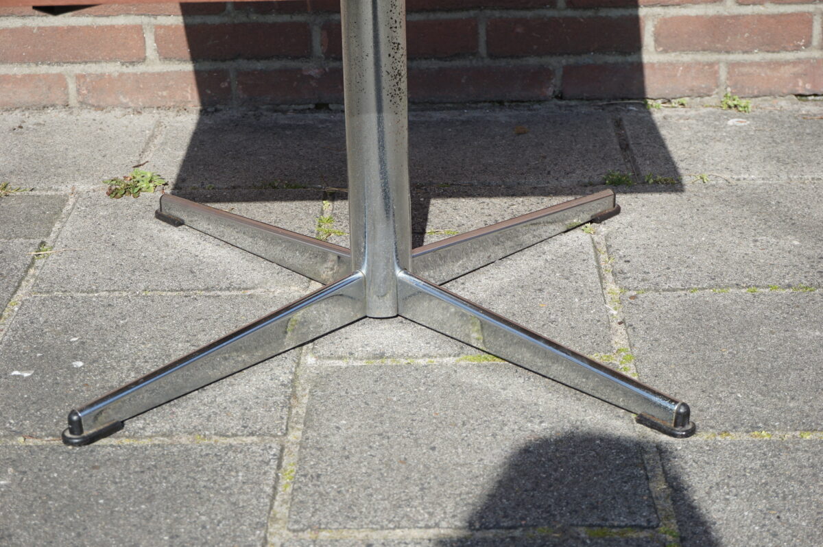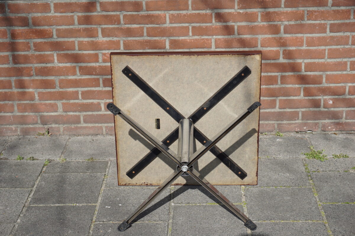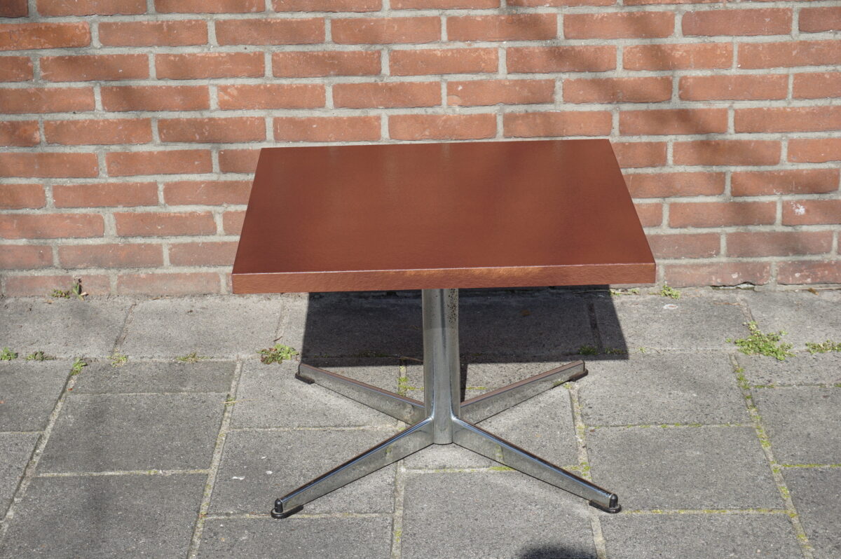 Vintage salontafel van Thijsselings Fabrikant NV Nijkerk Holland. De salontafel staat op een chromen poot met vier voeten. Het blad is in koperkleur gespoten. De tafel heeft aan onderzijde de sticker van Thijsselings. Afmeting: 60.5 cm breed, 60.5 cm diep en 42.5 cm hoog.
