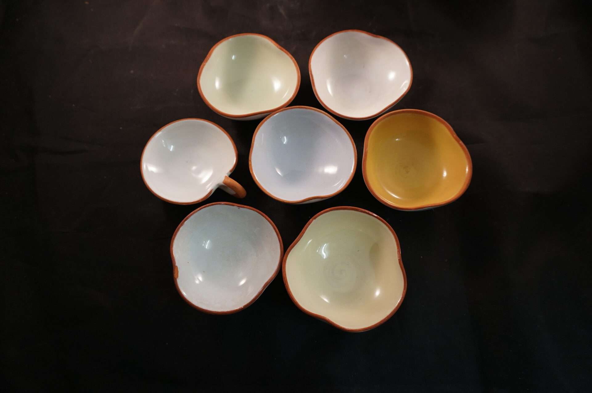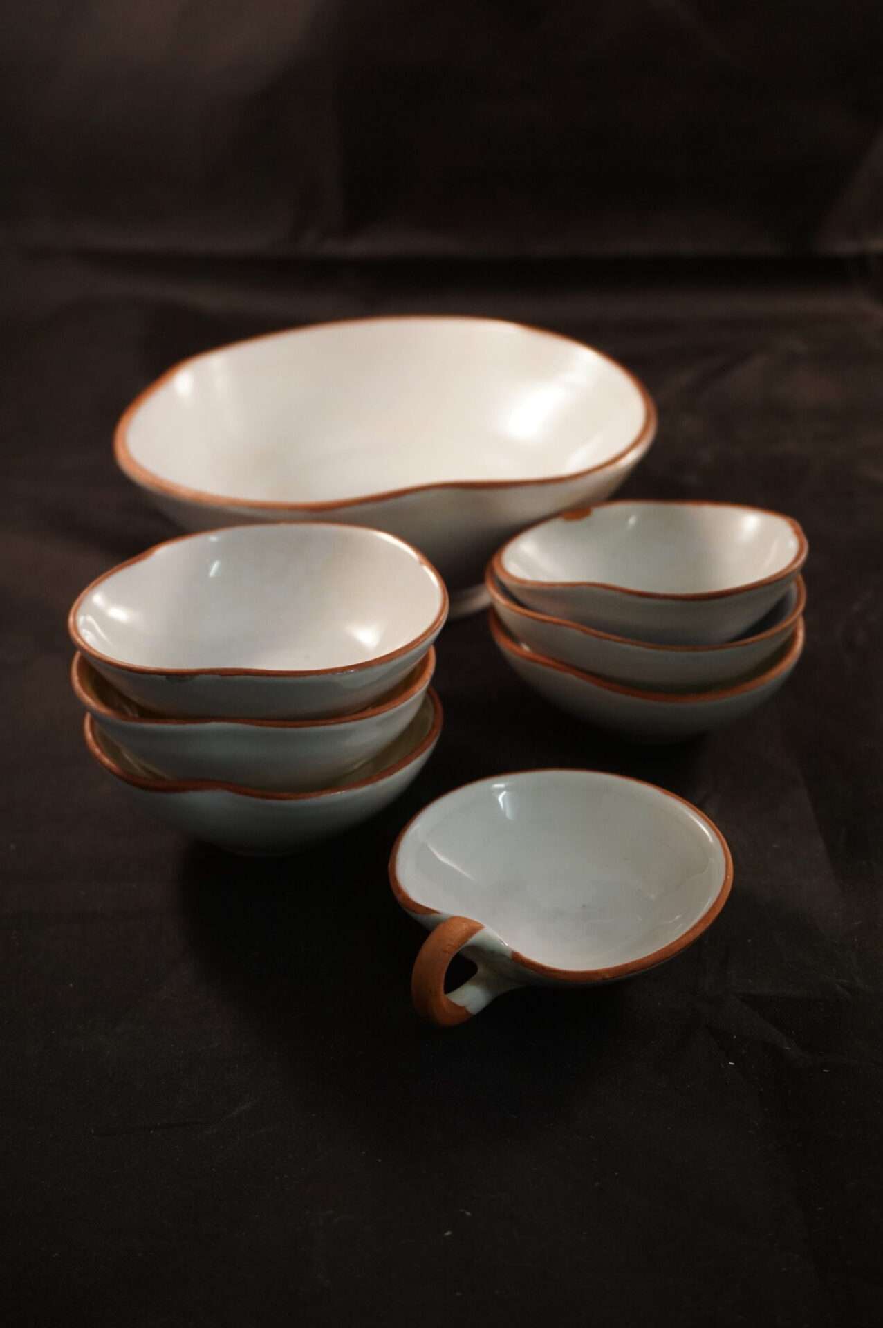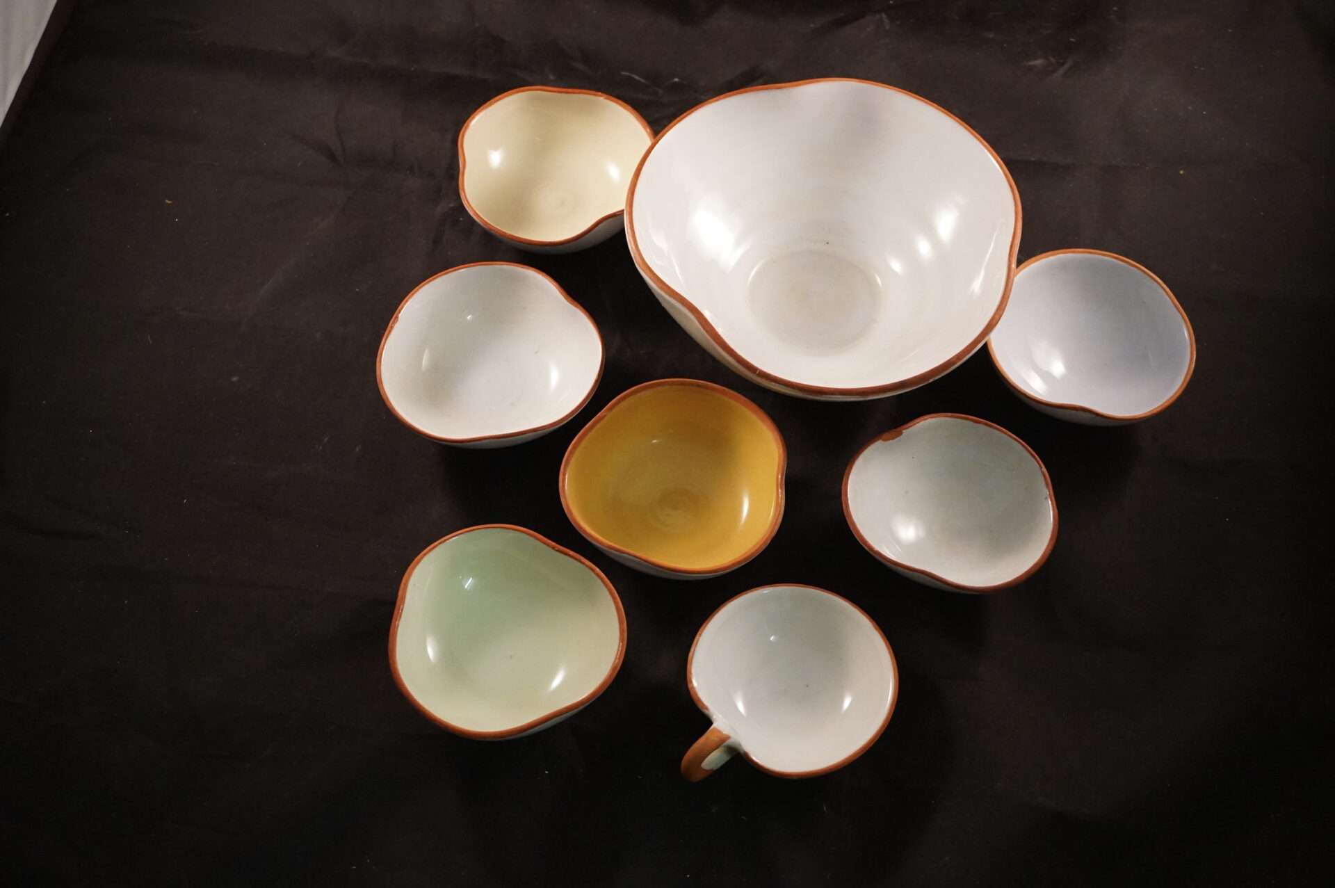 De set bestaat uit één grote kom en acht kleinere, onregelmatig gevormde schaaltjes. De kleuren variëren van wit en crème tot lichtgroen, geel en blauw/grijs. De randen van alle schalen zijn afgezet met een dunne, roodbruine lijn. Eén van de kleinere schaaltjes heeft een klein handvat, wat suggereert dat het als kopje of sauskommetje kan dienen. Ze zijn geschikt voor het serveren van kleine hapjes, snacks, of bijgerechten.