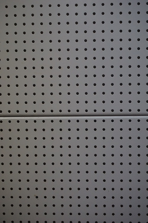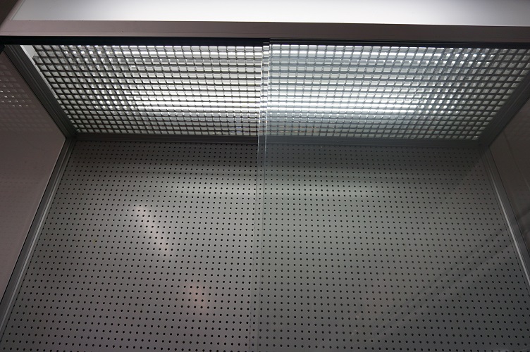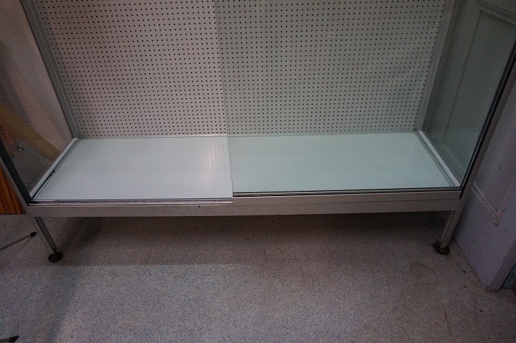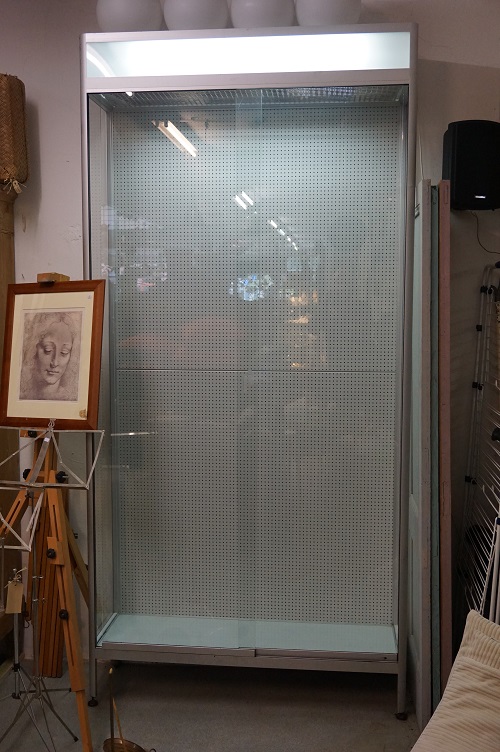 Hoge vitrinekast met lichtbak aan bovenzijde en twee schuifdeuren. Aan beide zijde glas en op de achterzijde zit geperforeerd metalen plaat. De kast staat hoger van de grond op stelpoten. Afmeting: ongeveer 258 cm hoog, 125 cm breed en 40 cm diep.
