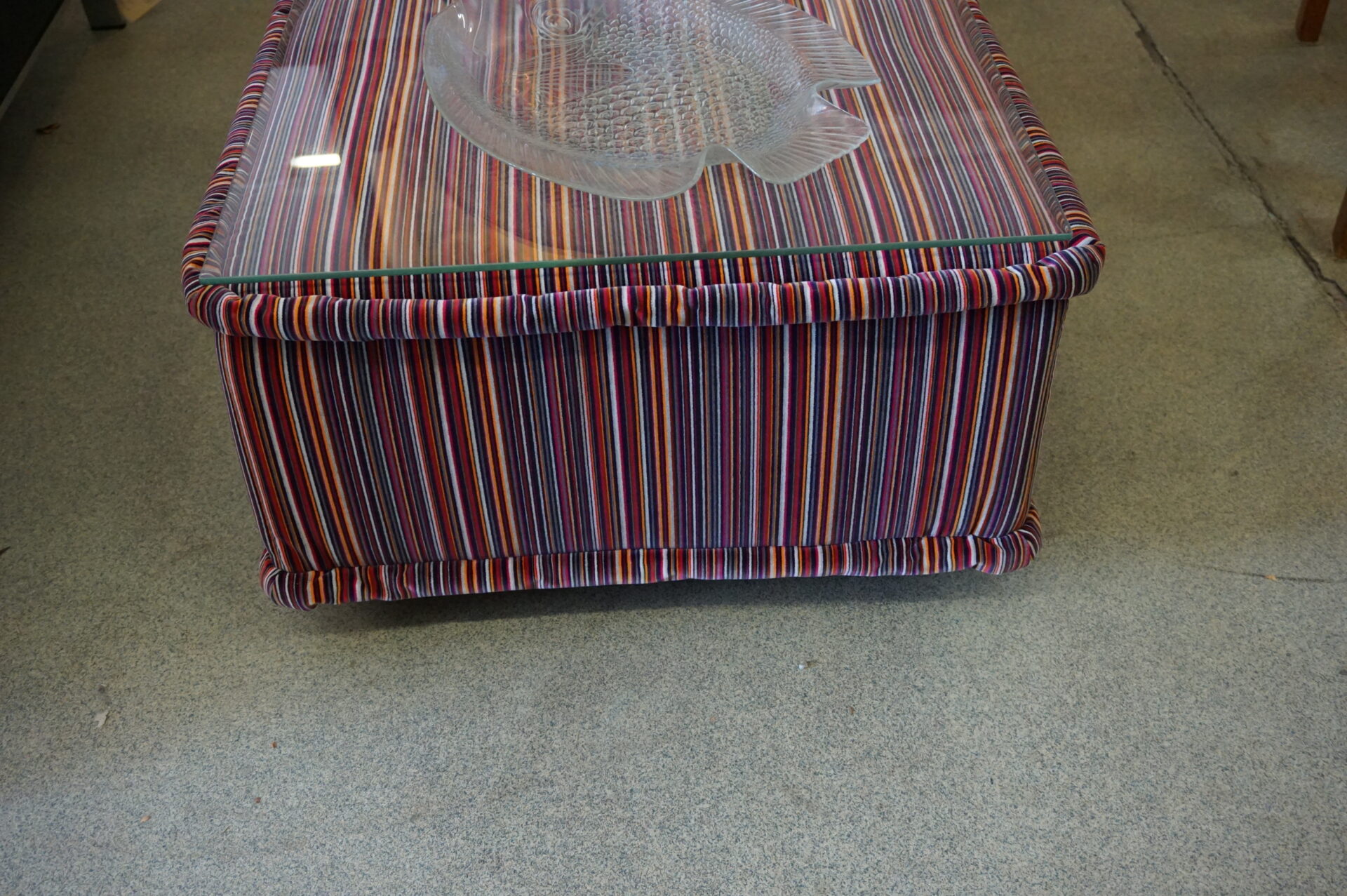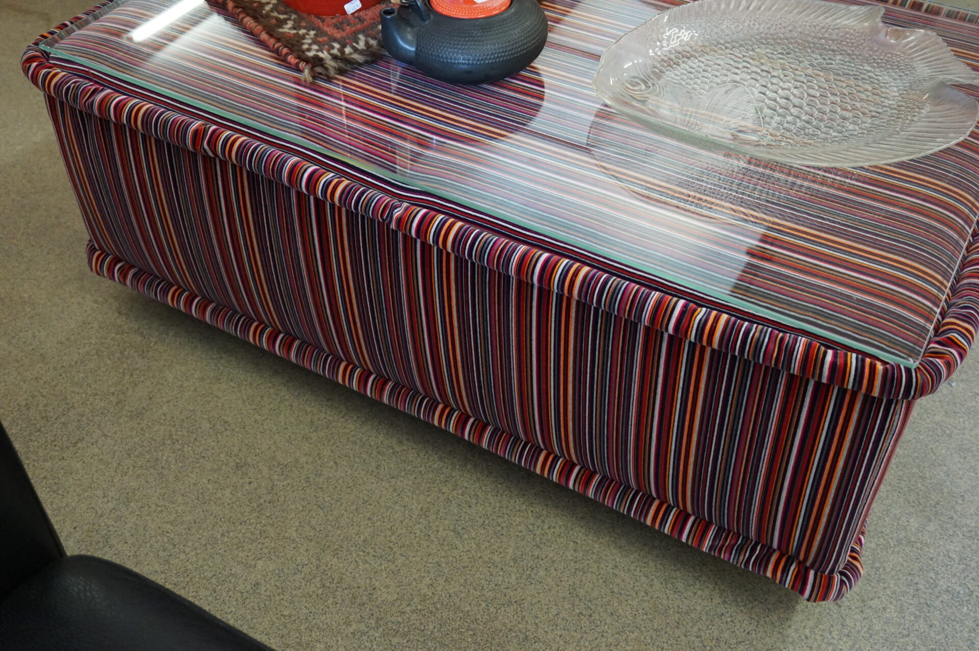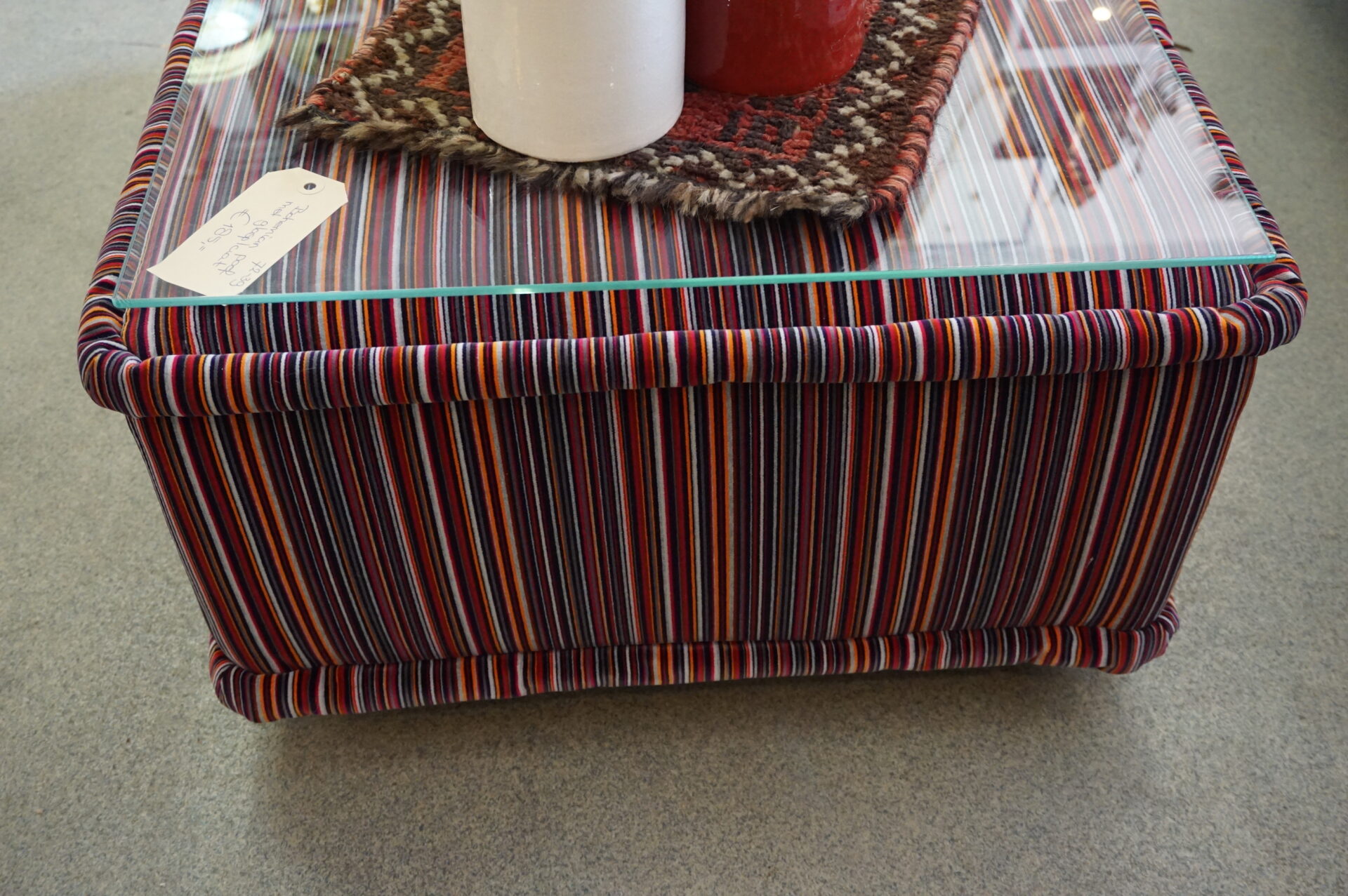 Zo goed als nieuwe poef, voetenbank of salontafel. Geleverd met glazen plaat. Prachtige kleuren. Gestreept design.