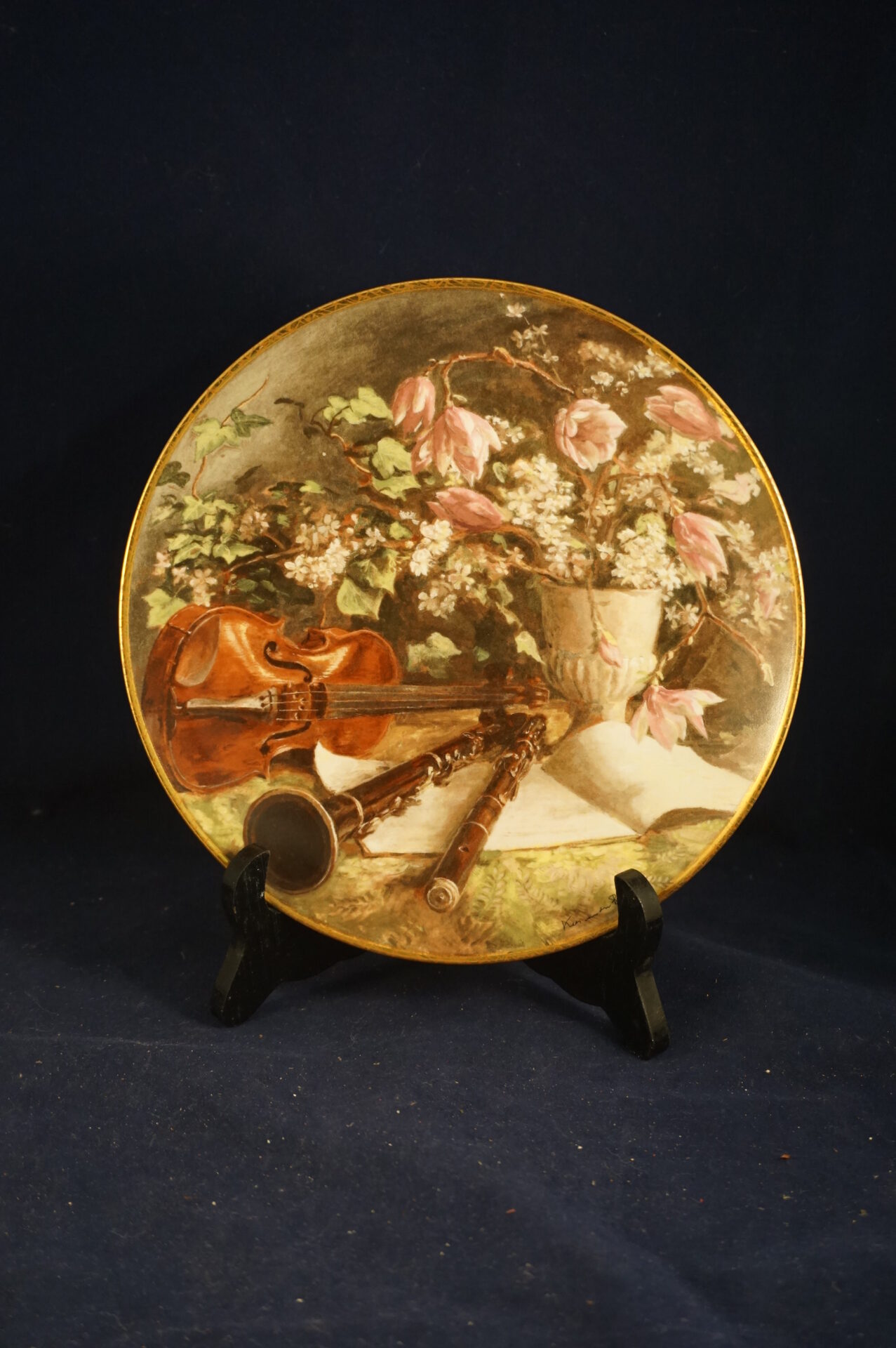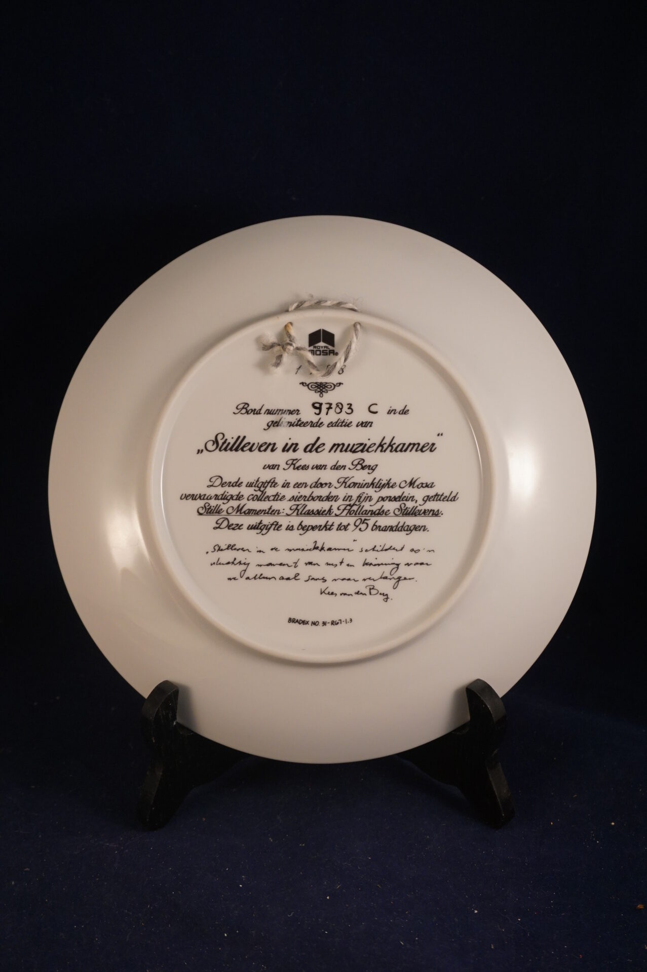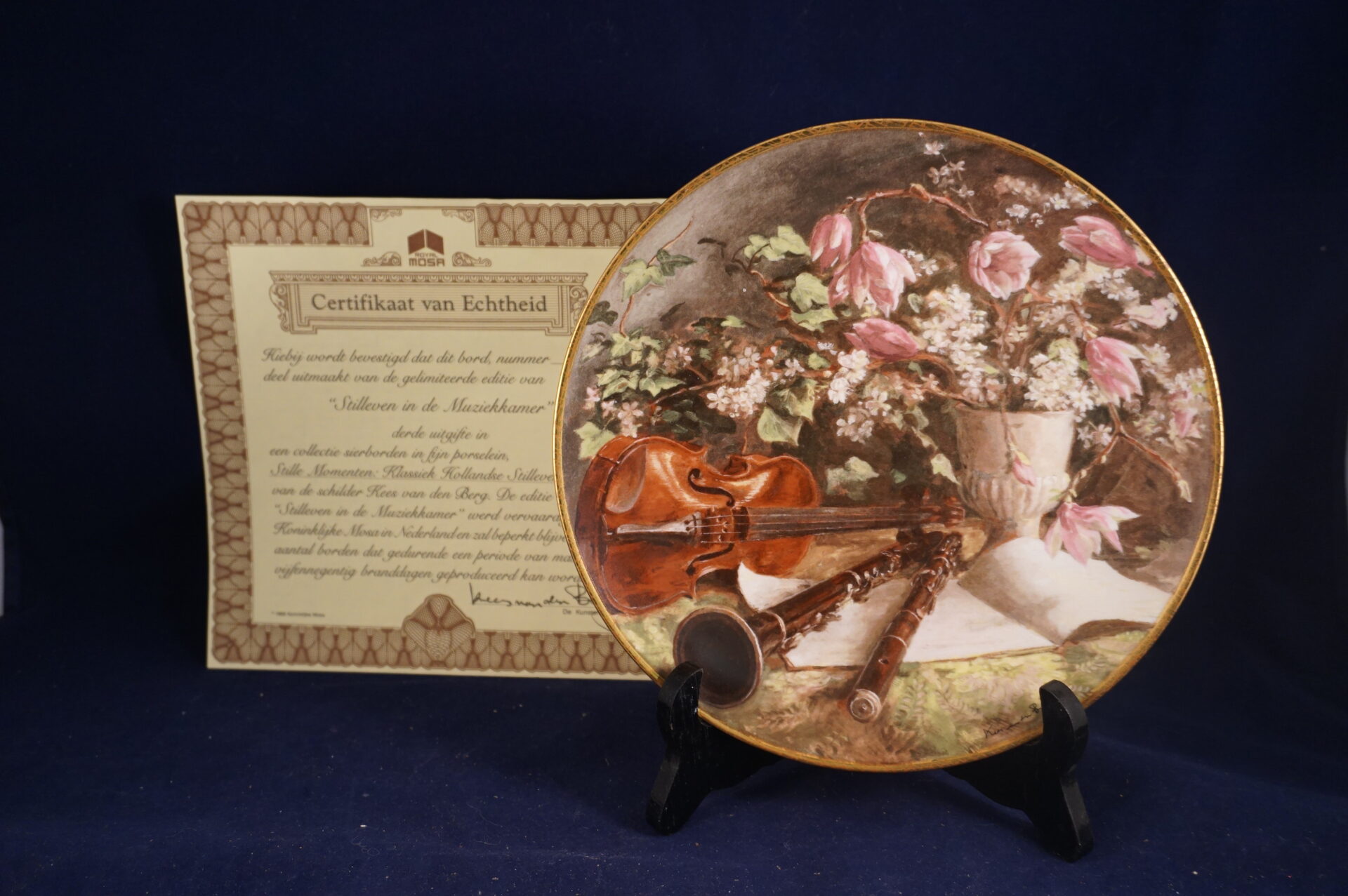 Een wandbord van de portretschilder Kees van den Berg. Derde uitgaven van een in beperkte editie uitgebrachte collectie sierborden in fijn porselein, getiteld Stille Momenten: Klassiek Hollandse Stillevens. Vervaardigd onder het kwaliteitsmerk van de Koningklijke Mosa B.V., Nederland. Het bord is in goede staat en is Stilleven in de Muziekkamer. Het bord is genummerd en wordt geleverd met een certificaat van Echtheid. Doorsnede bord ongeveer 21.5 cm.