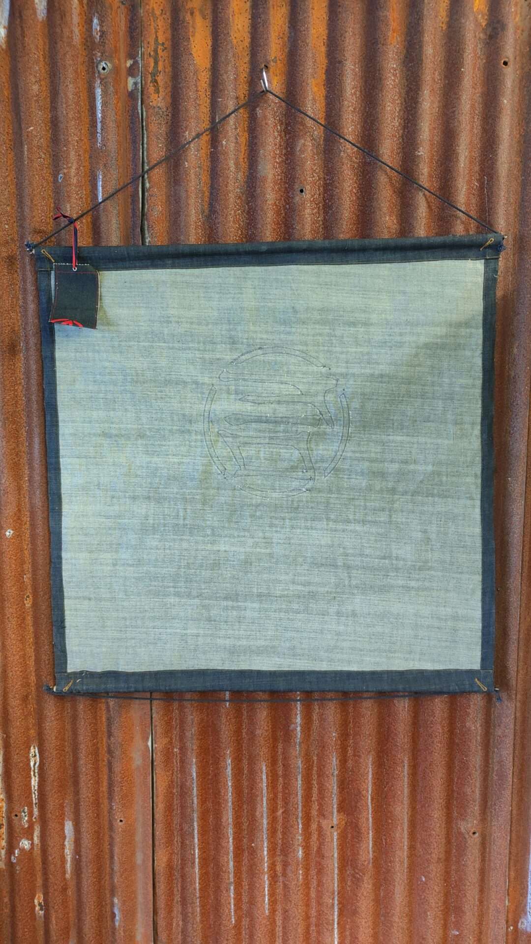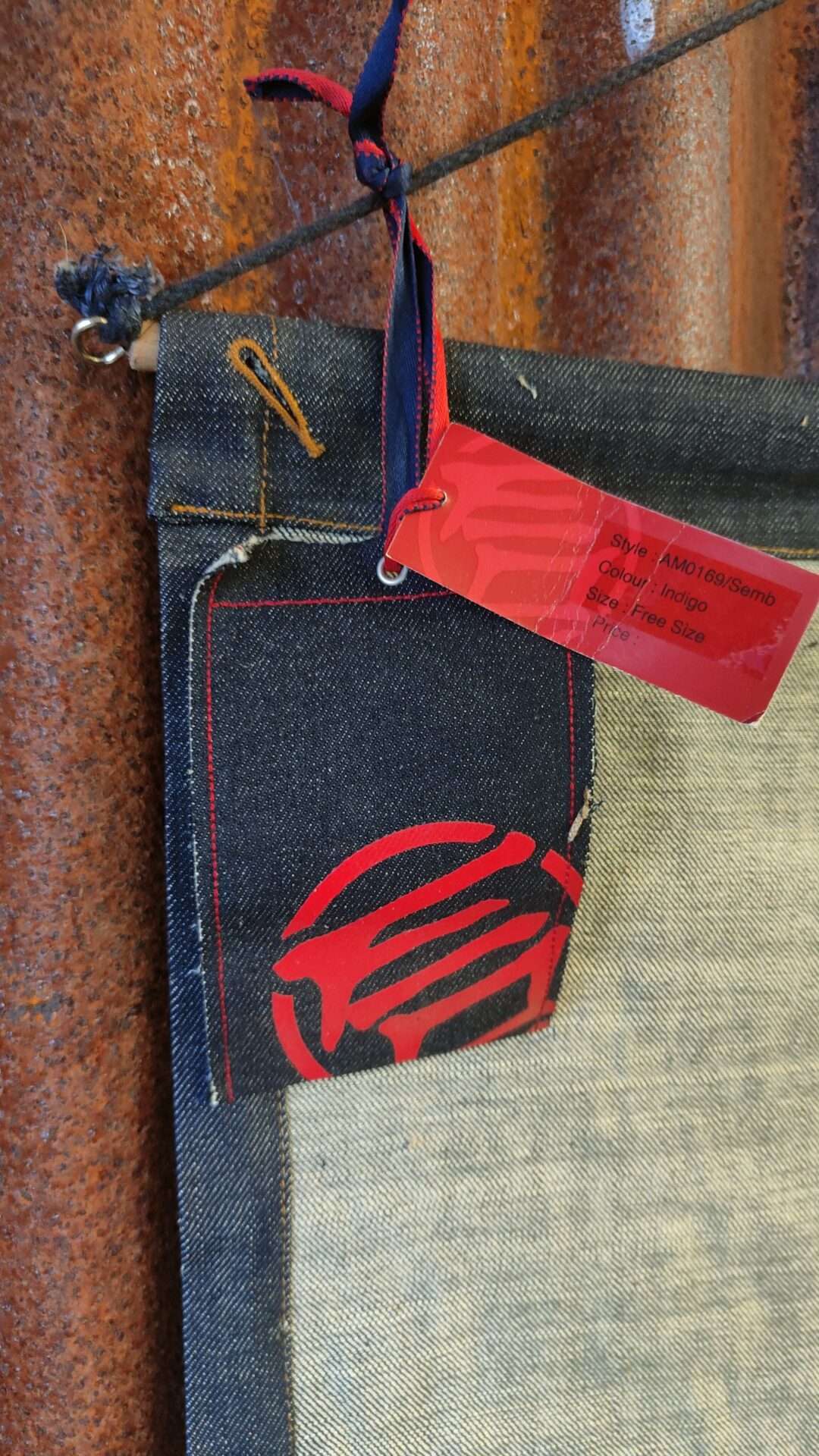 Ontwerp: Het doek is van donkerblauwe jeans gemaakt met rode tekst en een rood logo in het midden.