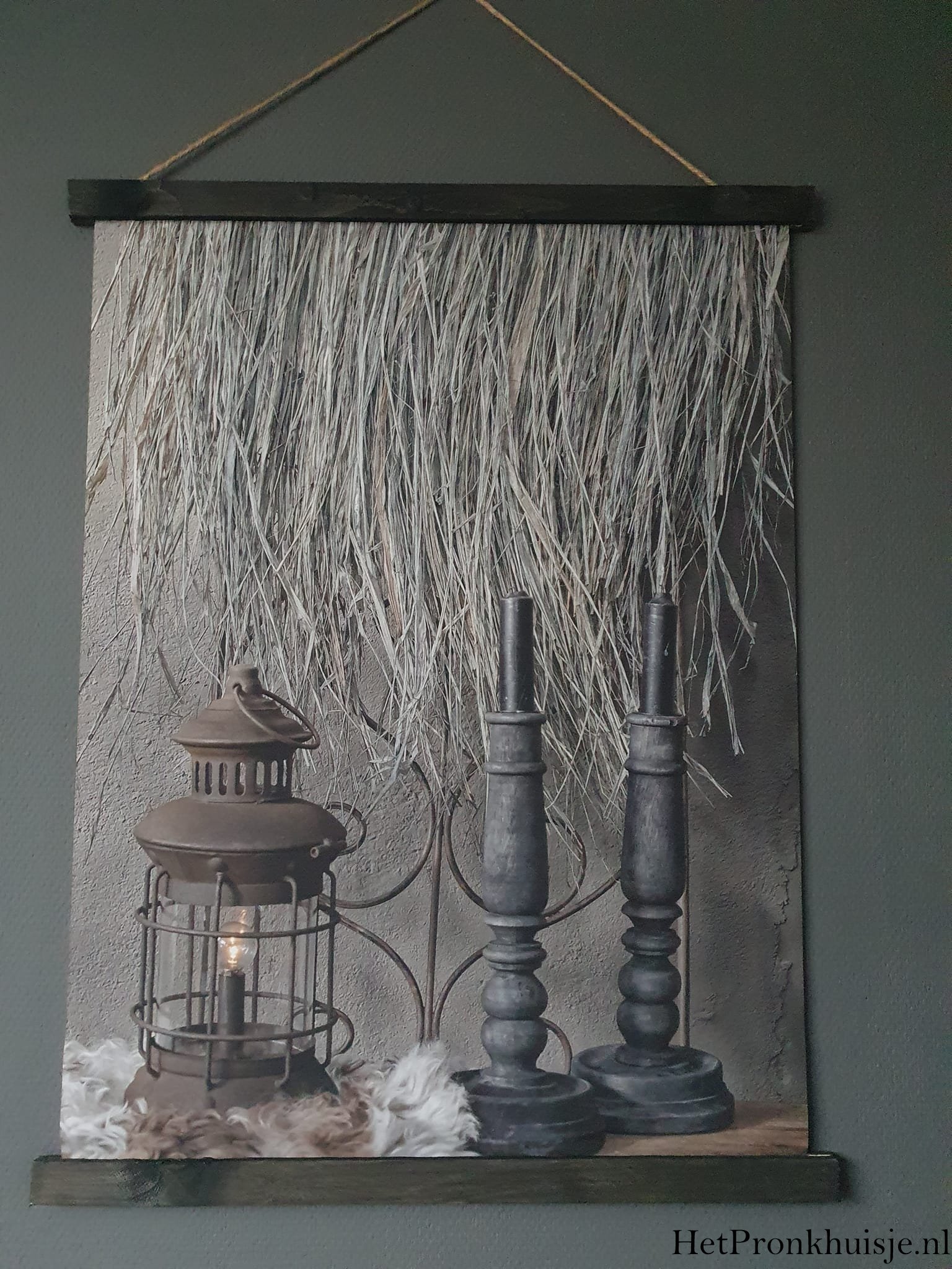 De doeken worden afgewerkt met houten latten en een robuust touw om hem op te hangen.
